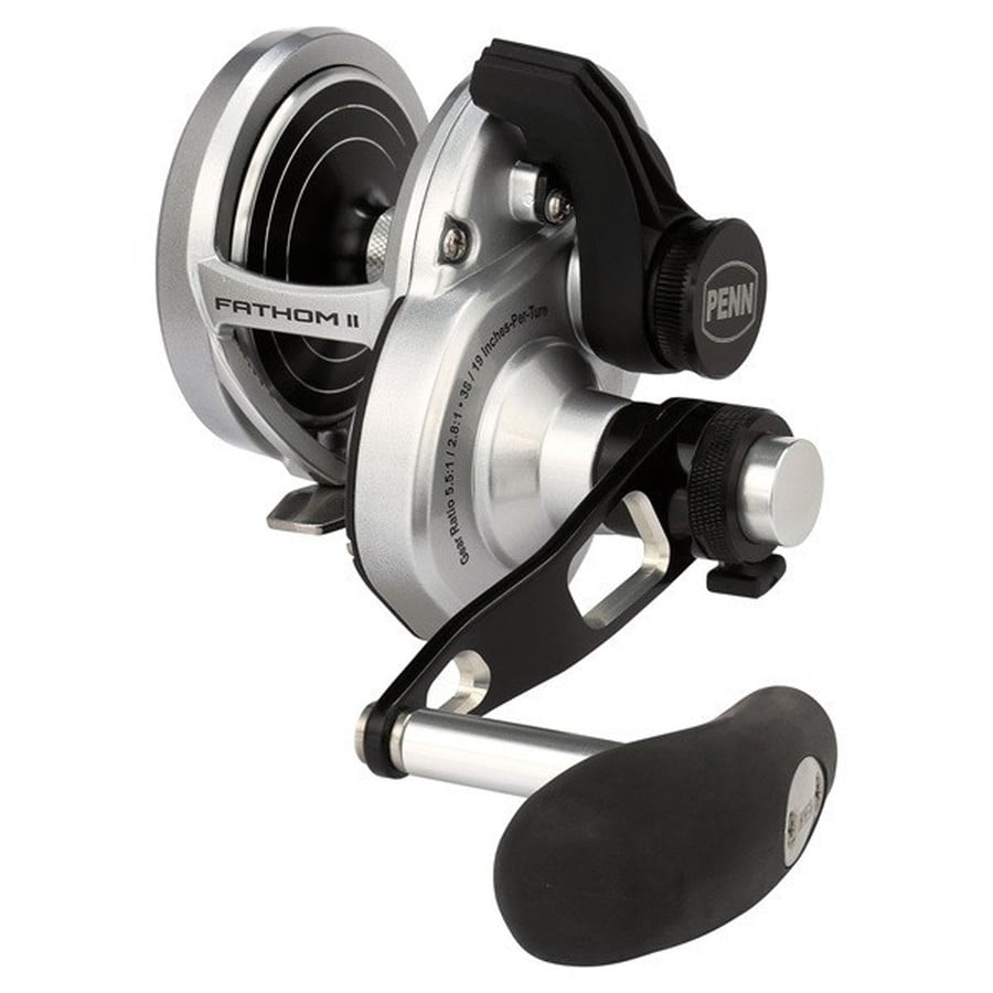 プッシュボタン(赤色矢印部)を押すことでハイギア→ローギアにクイックにシフト可能。ジギングなどで魚を誘う際はハイギア、ファイト中などパワーが必要なタイミングでローギアに切り替えるなど幅広い使い方が可能です。ローギアからハイギアに戻す際は黒いプッシュボタン(青色矢印部)を押すことでクイックに変更可能です。