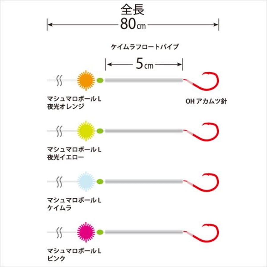 消耗の激しいアカムツ仕掛の必需品!●80cmの長めのハリス設定で、ほとんどの釣り人の仕掛にも対応可能。●人気急上昇!OH赤ムツ針でエサを選ばず、安心してやり取りが出来る。●アカムツ必須アイテムのマシュマロボール+フロートパイプでアピール抜群!