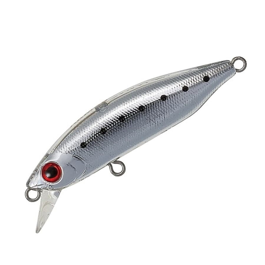可変アクションとはターゲットの魚種により反応が異なる事から、アクションの質が使い方によって変化するものです。その機能とは、スローリトリーブではローリングアクションでミディアムからハイスピードリトリーブではウォブンロールに変化します。メバルはスローが基本になりますが、メッキやカマスはミディアムからハイスピードのリトリーブやリアクションが必要となりそれに対応します。また、もうひとつの可変アクションは、着水後から水平姿勢でフォーリングバイブレーションをはじめ約70cmぐらいまで沈下、その後はラインの負荷を受けるため徐々にテールダウン姿勢に移行し、そして高比重タングステンの影響が出始め沈下スピードアップと変化して行きます。テールダウンの沈下途中でロッドワークによるトゥイッチを入れることで再び水平姿勢のフォーリングバイブレーションを再現、沈下スピードのコントロールやレンジコントロールが簡単に行なえます。トゥイッチによるイレギュラーダートやフォールではフラットサイドがアピールしバイトを誘発します。★サイズ:48mm ウェイト:4.1g カラー:62.メタルサイド