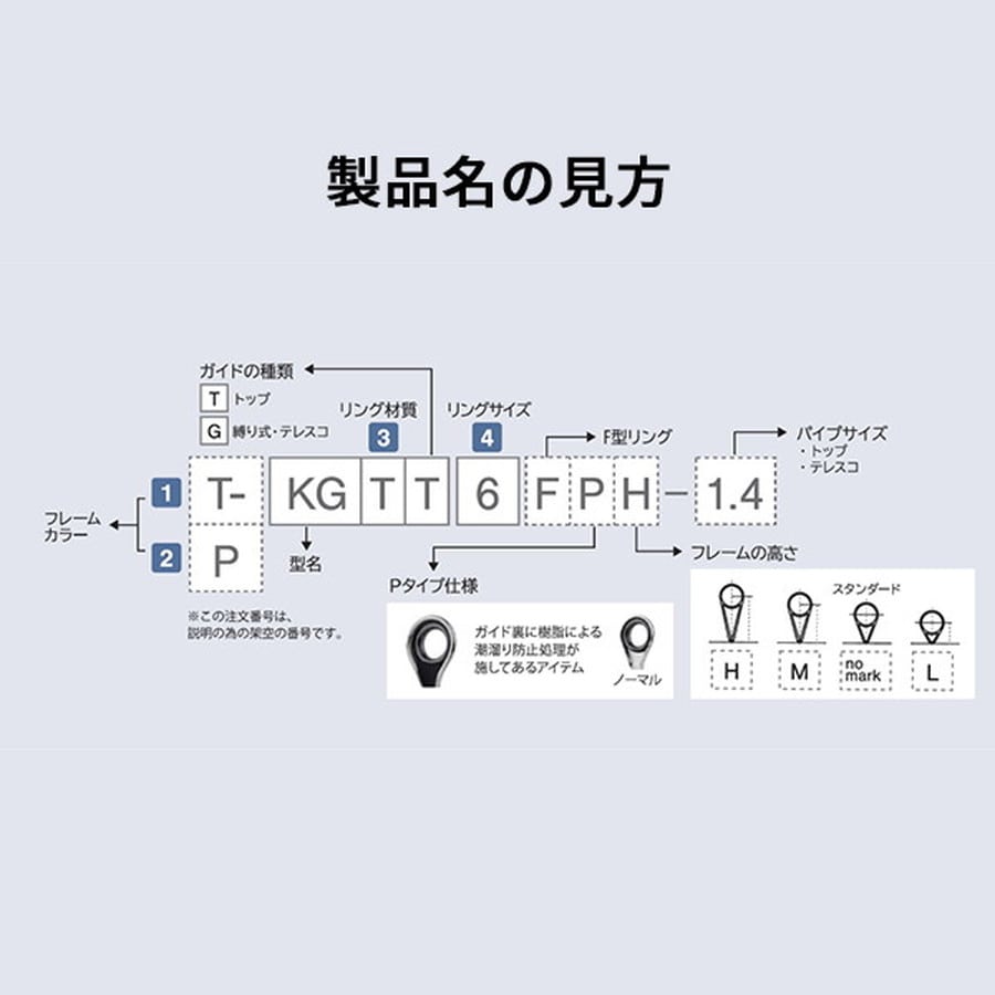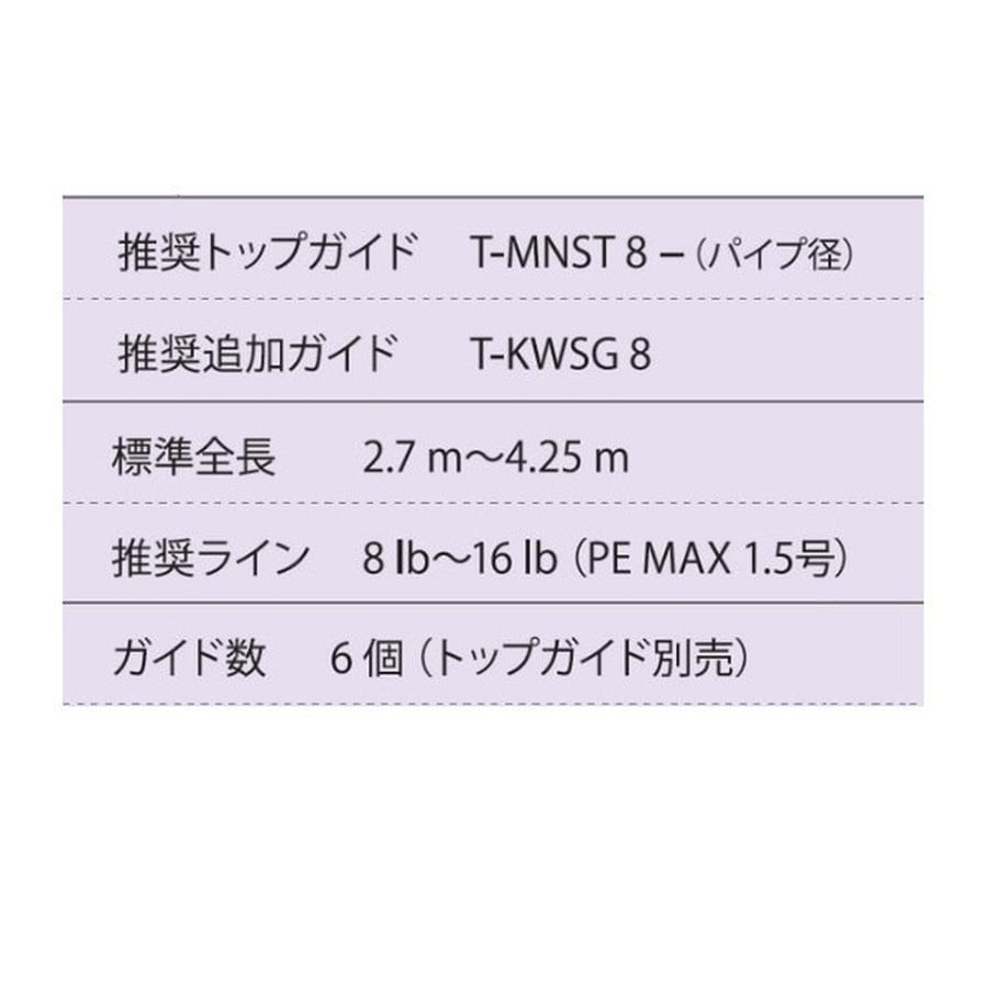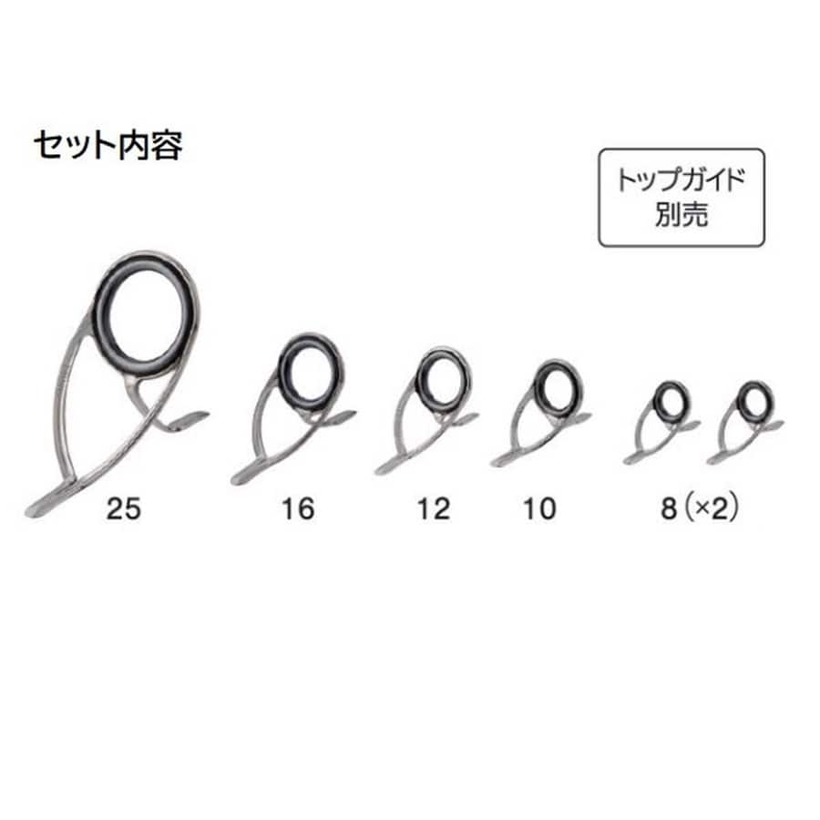 投げ用 ※トップガイドは別売りです。ティップ径に合わせてお選びください。★ガイド数:6個(トップガイド別売) 標準全長:2.7m~4.25m 推奨ライン:8lb~16lb(PE MAX1.5号) ※標準全長より長いブランクスの場合は、推奨ガイドをティップ部分に追加してください。