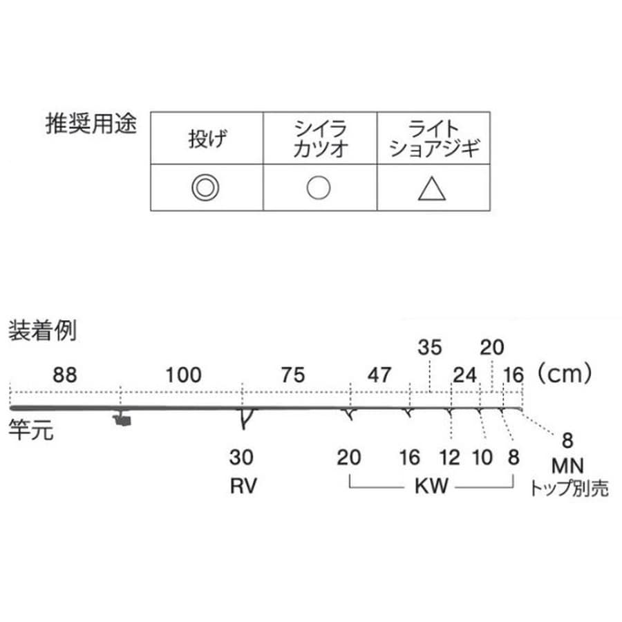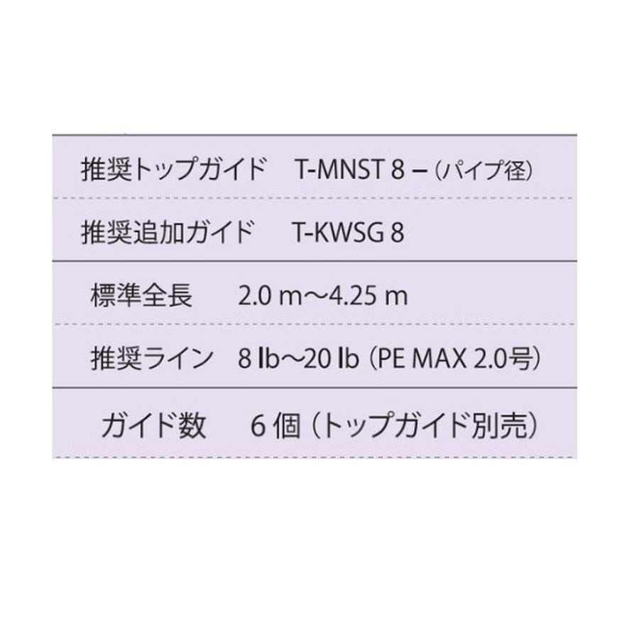 ガイド数:6個(トップガイド別売) 標準全長:2.0m~4.25m 推奨ライン:8lb~20lb(PE MAX2.0号) ※標準全長より長いブランクスの場合は、推奨ガイドをティップ部分に追加してください。