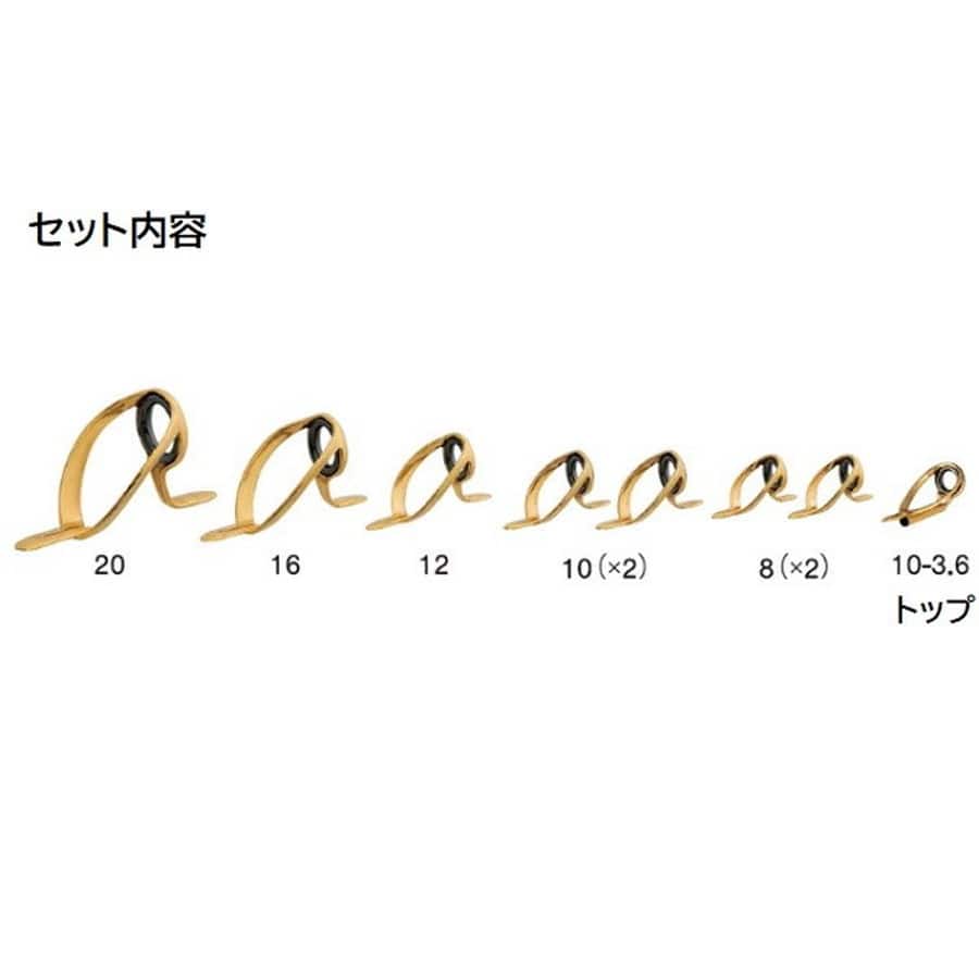 中大物用(ゴールド) トップガイド入りです。★ガイド数:8個(トップガイド込み) 標準全長:1.8m~2.5m 推奨ライン:PE15号~20号 ※標準全長より長いブランクスの場合は、推奨ガイドをティップ部分に追加してください。