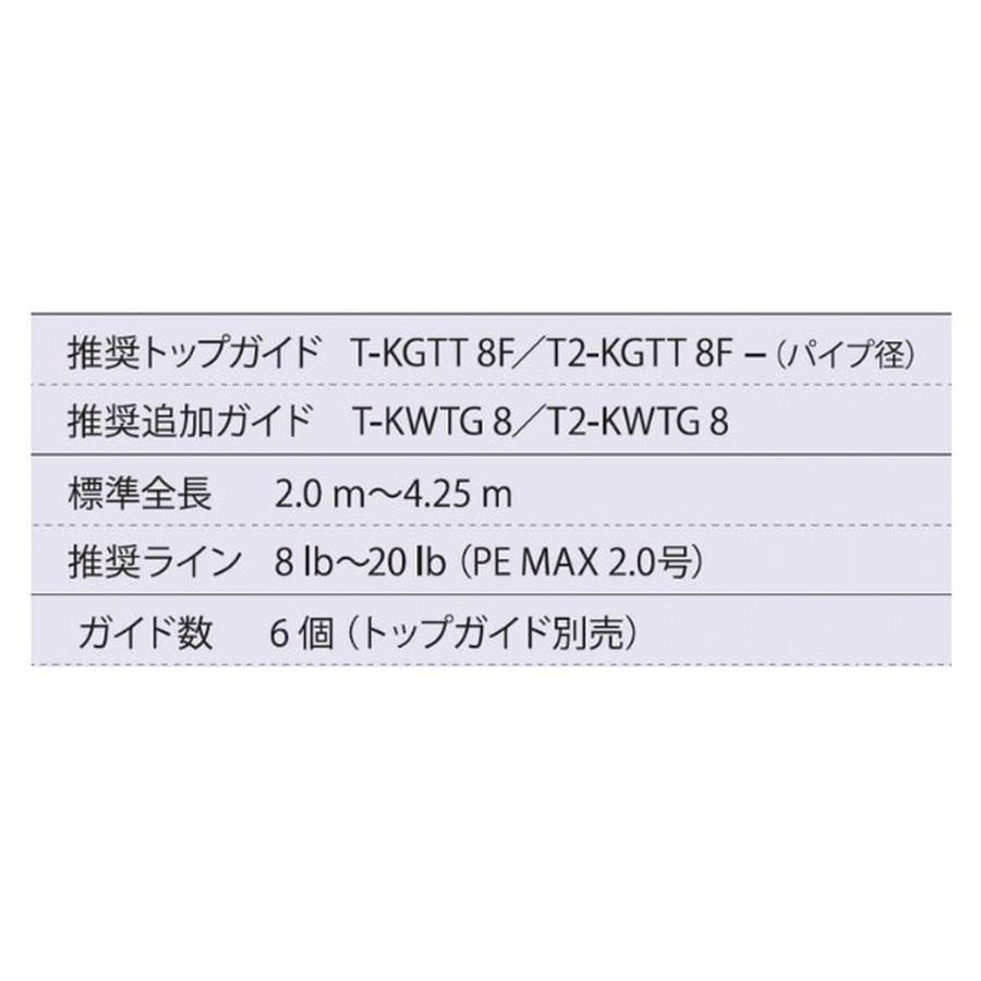 ガイド数:6個(トップガイド別売) 標準全長:2.0m~4.25m 推奨ライン:8lb~20lb(PE MAX2.0号) ※標準全長より長いブランクスの場合は、推奨ガイドをティップ部分に追加してください。