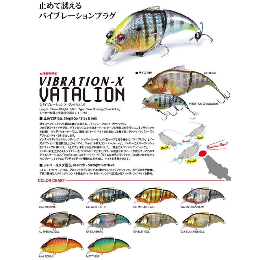 止めて誘える。Stop&Go / Stay&Jerk対サスペンドフィッシュ戦略を劇的に変える、バイブレーションX・ヴァタリオン。止めて誘うトゥイッチでは、ダイナミックな240度オーバーのターン&強烈なヒラ打ちによるフラッシングを披露! マッディウォーターでは、細身のジャークベイトをはるかに凌駕するフラットサイドパワーでリアクションバイトを引き出します。インターミディエイトのセッティング、シャローの一定レンジをキープさせる極小の「チップビル」とノーズポジションに独自設定したラインアイ、ジョイント式スラントテール・・・は、シャローのスローフィッシュをアクティブに誘い出し、「止めて」食わせるために編み出した、「黄金のスペシャルセッティング」。シャローに乱立するストラクチャーをSTOP&GOでかわしつつ、水面直下にウィードが茂るエリアでのステイ&ジャークなど、「止められないスピナーベイト」や、「ボトムに接地するクランク」では誘い出せなかったカヴァーフィッシュのアクティビティを積極的に引き出し、バイトを多発させます。シャローをタダ巻き。Hi-Pitch - Straight Retrieveストレートリトリーブでは、ジョイントボディならではの艶かしいライブアクションと、ボディ同士が接触して放つ独特なスクラッチサウンドを発生!シャロー&ミッドレンジの広域からフィーディングバイトを誘発。