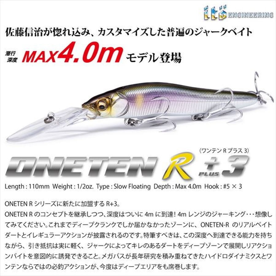 ONETEN R シリーズに新たに加盟するR+3。ONETEN R のコンセプトを継承しつつ、深度はついに4mに到達!4mレンジのジャーキング・・・想像してみてください。これまでディープクランクでしか届かなかったゾーンに、ONETEN-Rのリアルベイトダートとイレギュラーアクションが披露されるのです。特筆すべきは、この深度へ到達できる能力を持ちながら、引き抵抗は実に軽く、ジャークによってキレのあるダートをディープゾーンで展開しリアクションバイトを意図的に誘発できること。メガバスが長年研究を積み重ねてきたハイドロダイナミクスとワンテンならではの必釣アクションが、今度はディープエリアをも席巻します。※掲載している商品の画像は代表画像を表示しています。また実物と色が違って見える場合があります。あらかじめご了承下さい。