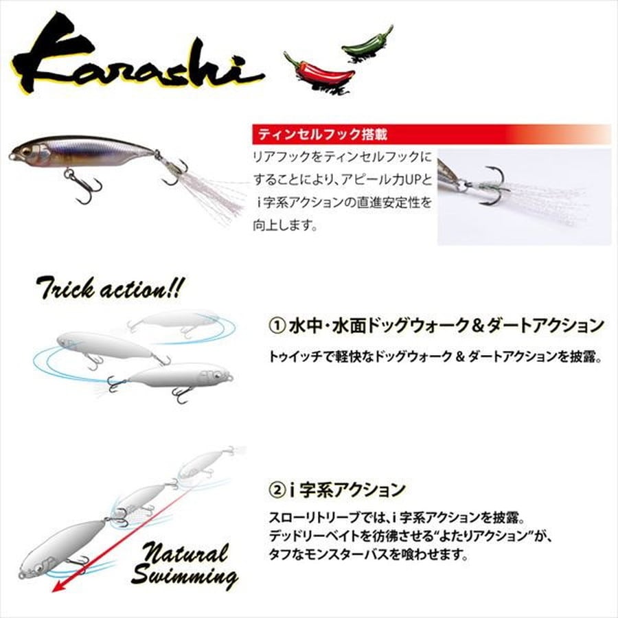 KARASHIは、ジャパンフィネスを体現する新世代のフィネスベイト。これまで3インチサイズのソフトベイトでアプローチしていた釣りを変える、ワーミングベイトです。スプーキーなビッグフィッシュが思わずキスバイトしてしまうリアルな一口サイズが秘めた、「スーパーナチュラル」は、見えるのに喰わないターゲットを完全制圧。一撃必中の「食わせのパフォーマンス」を披露します。① トゥイッチで軽快なドッグウォーク&ダートアクションを披露。② スローリトリーブでは、i字系アクションを披露。デッドリーベイトを彷彿させる“よたりアクション”が、タフなモンスターバスを喰わせます。極めてナチュラルな微波動によってクレバーフィッシュのバイトが多発。「トゥイッチによるダート」と「スローなi字系アクション」によるコンビネーションプレイで圧倒的釣果を生み出します。※掲載している商品の画像は代表画像を表示しています。また実物と色が違って見える場合があります。あらかじめご了承下さい。