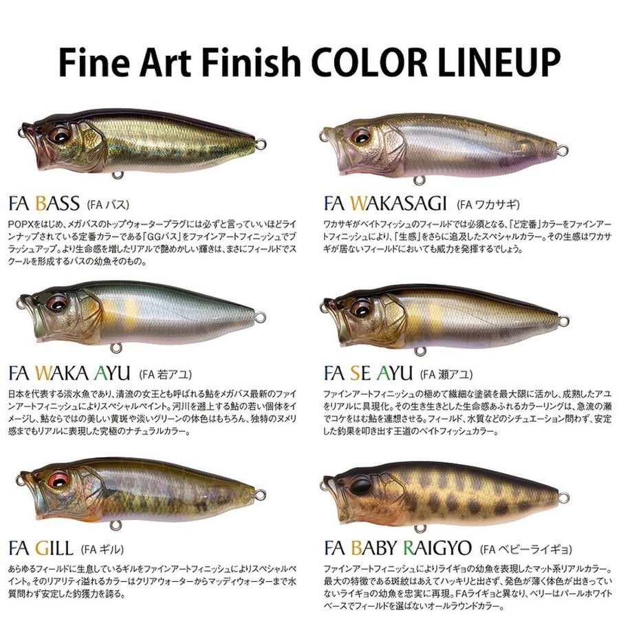 POPXをはじめ、メガバスのトップウォータープラグには必ずと言っていいほどラインナップされている定番カラーである「GGバス」をファインアートフィニッシュでブラッシュアップ。より生命感を増したリアルで艶めかしい輝きは、まさにフィールドでスクールを形成するバスの幼魚そのもの。