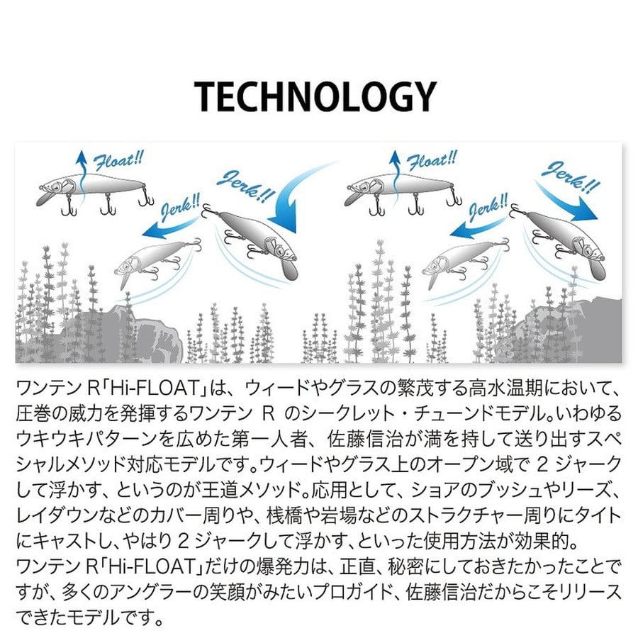 ワンテンR「Hi-FLOAT」は、ウィードやグラスの繁茂する高水温期において、圧巻の威力を発揮するワンテンRのシークレット・チューンドモデル。いわゆるウキウキパターンを広めた第一人者、佐藤信治が満を持して送り出すスペシャルメソッド対応モデルです。ウィードやグラス上のオープン域で2ジャークして浮かす、というのが王道メソッド。応用として、ショアのブッシュやリーズ、レイダウンなどのカバー周りや、桟橋や岩場などのストラクチャー周りにタイトにキャストし、やはり2ジャークして浮かす、といった使用方法が効果的。ワンテンR「Hi-FLOAT」だけの爆発力は、正直、秘密にしておきたかったことですが、多くのアングラーの笑顔がみたいプロガイド、佐藤信治だからこそリリースできたモデルです。