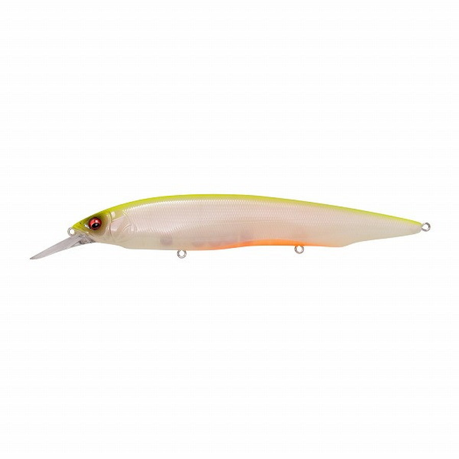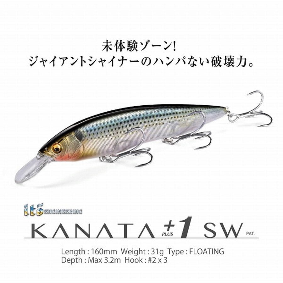 カナタ+1 SWは、カナタSWの潜行深度より1m深く、最大潜行深度を3.2mに設定したダイビングモデル。カナタSWと同様、160mmというビッグサイズにも関わらず引き抵抗は極めて軽く、テンポよくエリアをサーチするレスポンシビリティも兼備。更に磨きをかけたハイピッチ・ロールアクションにより、ビッグボディとは思えないナチュラルタイトな波動とリアルな明滅アピールを生み出します。防波堤や沖堤など足場の高い場所からのアプローチで、一段下のレンジを足元まできっちりと攻め抜くことが可能なカナタ+1 SWは、大型のベイトを追って日中にタナ落ちしたシーバスや青物の攻略に無類の強さを発揮します。圧倒的な存在感と、捕食中枢を刺激してやまないナチュラルな泳ぎを両立させた、ハイインパクトミノー「カナタ+1 SW」が、フィールドをより広く、より深く攻略していきます。