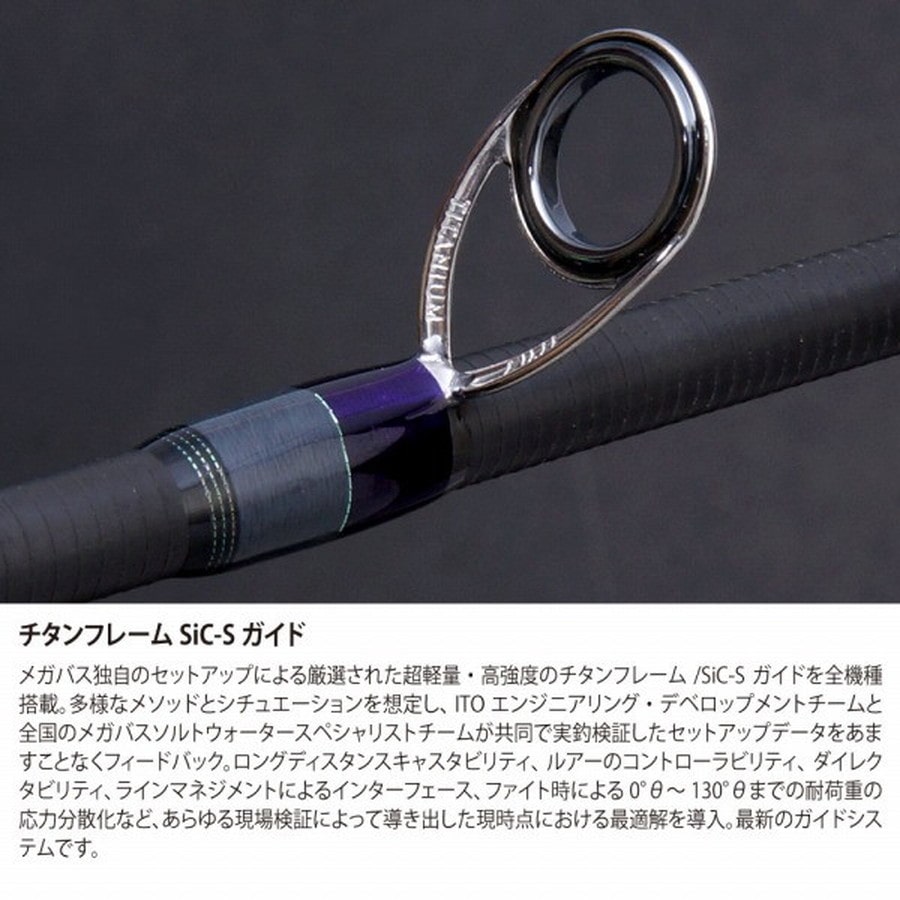 「MEGADOG MASTER」の名の通り、MEGADOGの持つ異次元のポテンシャルを最大限に引き出す、海のビッグベイトゲーム専用ロッドです。130gのMEGADOGをスーパーロングディスタンスキャストで投げ抜く驚異のキャスタビリティと、ベイトを的確に動かし続けられる軽快な操作性を追及。メガバス最新のデストロイヤー5Dグラファイトシステムが具現化した7'7"のハイパワーシャフトは、荷重負荷と適宜連動するスムーズなレギュラーテーパーを生み出しました。ルアーアクションが視認しづらい視界が効かない状況でもドッグウォークのタイミングをつかみやすく、ラフな操作でもだれもがイージーに180度オーバーのスライド&ターンを決めることができます(※MEGADOG使用時)。ハイテンションのベリーセクションと高い剛性を誇るバットセクションによって、MEGADOGを胴に乗せ、楽々とポイントへふっ飛ばす圧巻のキャスタビリティを発揮。★Length:7'7" Lure capa:MAX 150g Line capa:MAX PE 8.0 Taper:REGULAR Section:2pcs.