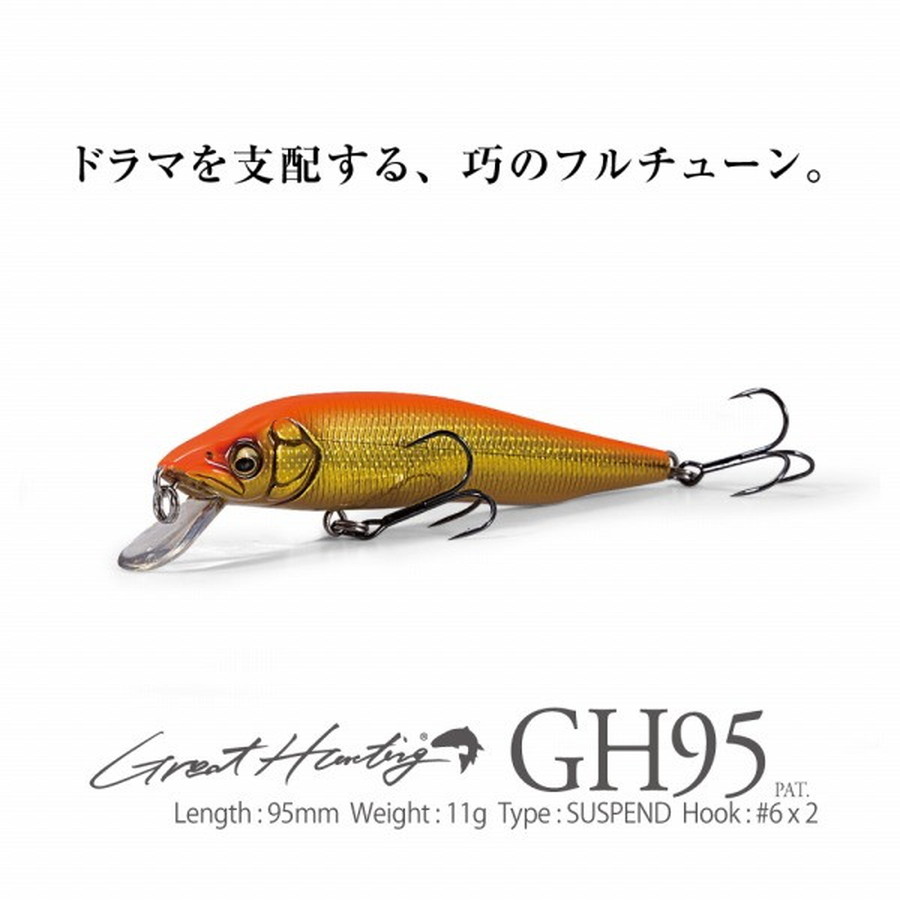 シャフトバランサーシステム(PAT.)を搭載したGH95は、アクションのロール軸上にシャフトバランサーをシンクロさせるパッケージングによって、リールハンドルのノブに指をかけた瞬間から、リトリーブに即応し、スクリュー回転のごとき驚異的な撹拌系のロールアクション「ハイピッチ・ドライブ」を発生。また、GH95のウエイトマウント方式は、起き上がりこぼしの原理から、ストップ時には「ブルっ」と身悶えするようなボディの復元動作を発生させます。「ストップ&ゴー」の繰り返しのみでスレた鱒族を次々と狂わせる不思議な力が、サツキマスやスーパーレインボーをはじめ、クレバーな大型鱒族を虜にします。★Length:95mm Weight:11g Type:SUSPEND Hook:#6 x 2