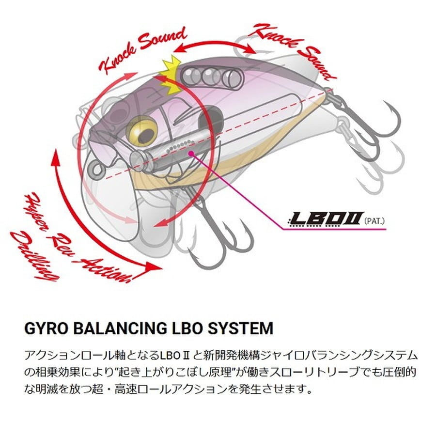 OR(オーバーレヴ)・・・その名のとおり、リミッターを振り切って高速回転するさまは異次元。ロールドライブを劇的に高速化させた次世代のフラットサイド・シャロークランクです。ORCの超・高速ロールは、内蔵された新開発機構、「GYRO(ジャイロ)・バランシングLBO PAT.」による、“起き上がりこぼし原理”の高速化によって生み出しています。だから、明滅効果を得るために行ってきた、これまでのフラットサイドのように早く引く必要がなくなり、スローリトリーブでも激しい明滅とスクリュー波動を放ちます。水面直下を長時間レベリング・ロールできるからバイトが多発。より濃密なシャローコンタクトを可能としています。さらにスローに引けば、トップウォータークランクとして活躍。その時、ボディをリズミカルに叩くジャイロバランサーは、硬質なアタックサウンドを水面下へと放ってアピール。シャローカバーの回避能力を飛躍的に高め、カバーから離れたところからでも果敢にバイトを引き出す圧巻のORCは、シャローゲームの革命児です。