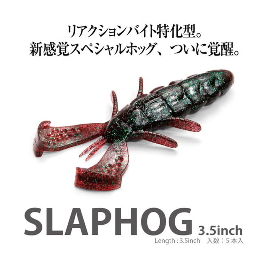 テスト中、ボトムの喰わせにとどまらず、ジグストでは果敢にビッグバイトを連発させてきた驚異のリアクションマジック、SLAPHOGが覚醒。米国B.A.S.S.ツアーを戦うチャレンジングなスペシャリスト、木村建太の熱い思いと知見、幾多のリアクションバイト伝説を築き上げたディープカップビーバーの開発者、伊東由樹のハイドロデザイニングが高度に融合。圧倒的なリアクションバイトを引き出すSLAPHOGが生まれました。各所に設けた特異な面構成と多角形ディンプルが水を効果的に掴み、僅かな水流でも即応してアクションを始動するフラップアームは、いかなる体勢でもハイピッチアクションと強波動を発生してアピール。なお、4本のサブアームは、フォール中はもちろんのこと、ピックアップ中でも絶えずビビッドな振動を発生させ、生命感をフルタイム演出。常にバイトを誘引し続けます。ハイプレッシャーフィールドで釣り勝つための、競技志向のスペシャルベイトです。