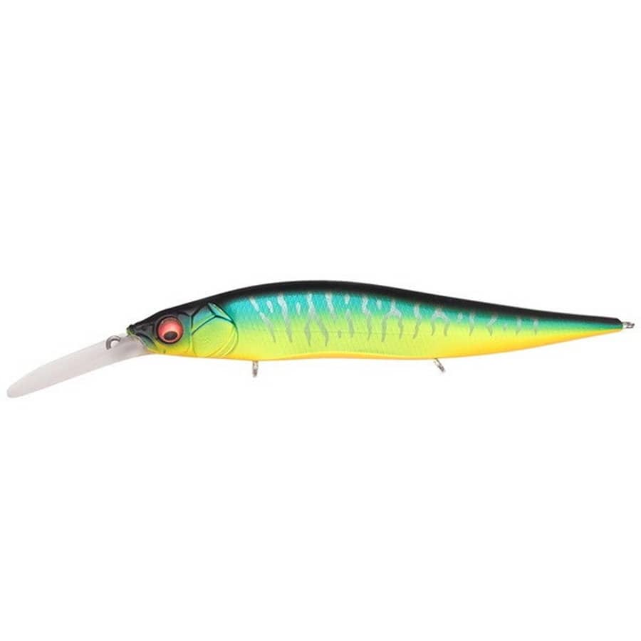 VISIONONETEN+2Jr.は、USツアーで圧倒的実績を誇るONETEN Jr. +1をベースとし、ミッド~ディープレンジにおいて更なるアドバンテージをもたらすべく開発されたロングビルジャークベイト。特殊形状のダイビングビルをボディ中心軸上にセッティングし、ロングリップながらもキレ味鋭いワイドなダートアクションを実現。最大3mに達する優れた潜行性能を発揮し、水圧のかかるディープレンジでも実に軽やかに左右へのダートアクションを披露します。エッジの効いたフラットシェイプボディから放たれる鮮烈なフラッシングとダート、フラッタリングは、深層のクルージングフィッシュへのリアクションバイトを果敢に引き出します。同時に、ボディの前面投影内にマウントさせたダイビングビルは、キャスト時の空気抵抗を驚異的に軽減。直列配列したデュアルタングステンウエイトによる重心移動システムとの相乗効果により、逆風を突く卓越した飛距離を実現。勝つための競技専用モデルです。