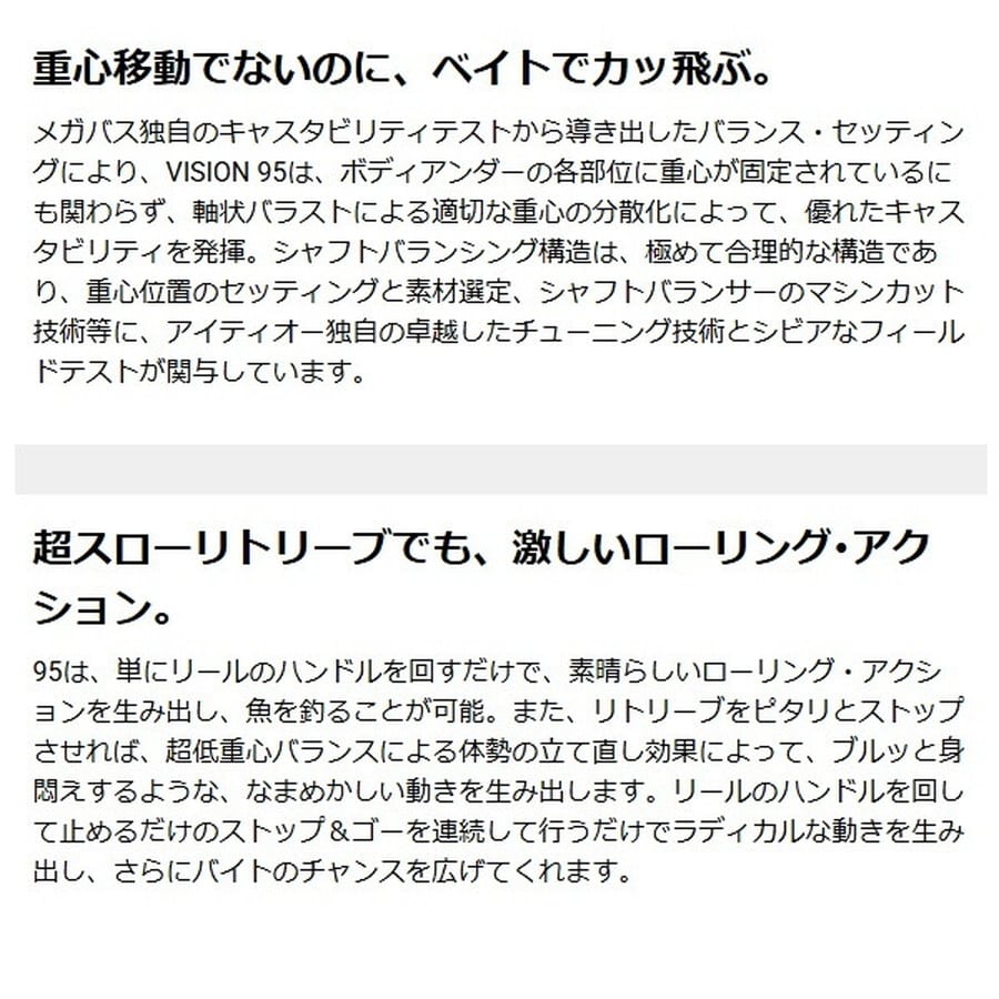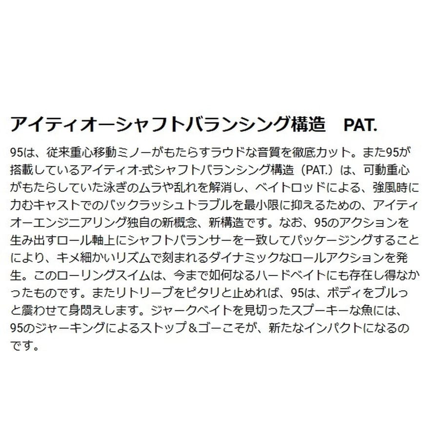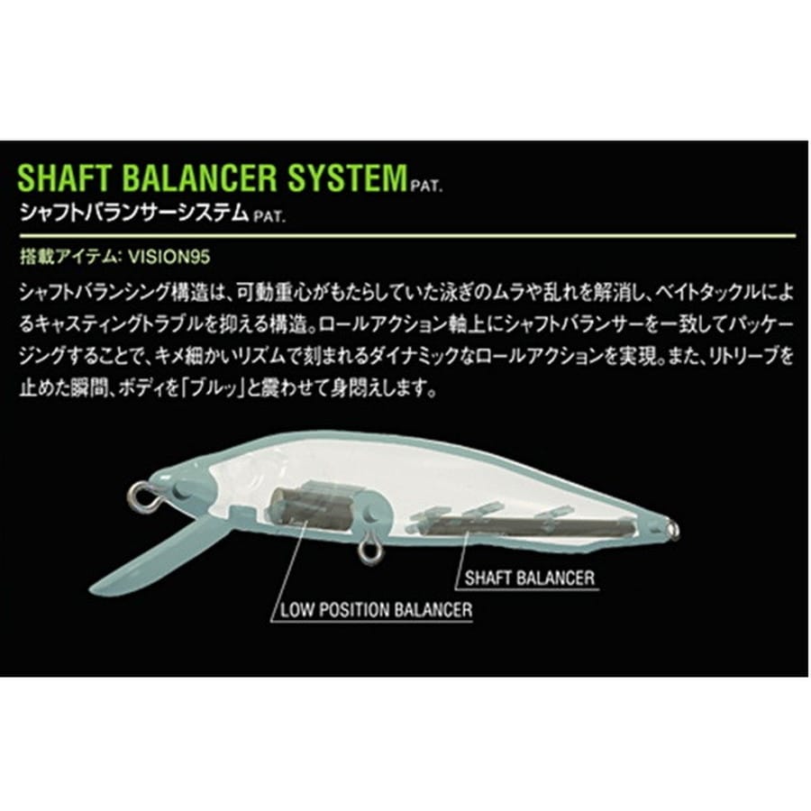 リアルベイトと見まちがう程のサイレントなエスケープダートを披露。ビジョン95(VISION Q-GO)は、異次元のアクションを生み出し、ロングキャスタビリティを実現した、アイティオー独自のシャフトバランサーシステム(PAT.)を搭載。95は、ローリングアクションの軸上に、シャフトバランサー(PAT.)を固定設定。他の重心移動システムや低重心設計では生み出せない、静止直前に見せる「ブルッ」と身悶えする復元動作や、スクリューのごとき驚異的な撹拌系ロールアクションをみせます。95は、ジャーク時においても、重心移動バランサーが、激しいジャークの挙動で移動し、ボディ後尾へヒットする際発していた衝撃音や衝撃波などをまったく発生させません。軽めのトゥイッチにも鋭敏なレスポンスで無音の挙動変化を生み出します。いかなるロッドワークでもリアルベイトライクなエスケープダートを披露。叩き抜かれたメジャースポットのモンスターに忍び寄り、突如その視界に出現する。ビジョン95(VISION Q-GO)独自の生々しいアクションは、他では生み出せないライブベイトそのものの鮮烈なインパクトといえるでしょう。