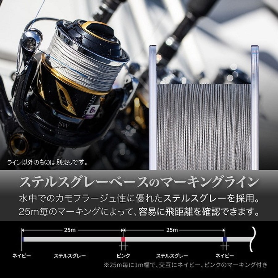 従来のPEラインに比べて、耐摩耗性能と耐久性を200%以上アップ!* 独自開発した特殊コーティングによって、PEの弱点を完璧に克服した。素材に選んだのは、完全8本撚りのSUPER MAX POWER原糸。従来のPEラインに比べて、直線強度も2ランクアップ*。ラインカラーには、水中でのカモフラージュ性に優れたステルスグレーを採用。25m毎のマーキングによって、容易に飛距離を確認できます。最先端の素材と製法、そしてテストを重ねることで生まれたキャスティング専用PEラインの最高峰。強度、耐久性、抜群の飛距離、スムーズなフィーリングなど、キャスティング用PEに求められるすべての要素を最高レベルで叶えるラインです。