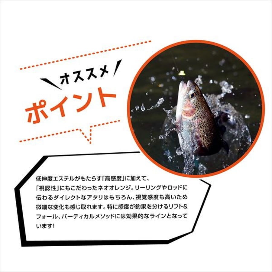 エリアトラウトのハイスタンダードライン素材「エステル」。トーナメントシーンのみならず、エリアトラウト攻略に不可欠な存在です。スーパーエステルは適度な「張り」を持たせて高感度を追求し、ルアーの動きやトラウトからの微細な反応をダイレクトに感じることを主眼に置いて設計。さらにネオオレンジカラーは視認性にもこだわり、「見える」という武器も備えていますハイレスポンスラインだからできる精緻なレンジコントロールやさり気ない誘いが可能。リトリーブによるアプローチはもちろん、フォールアクションを多用するバーティカルメソッドやボトムメソッドでもスーパーエステルネオオレンジが活躍します。ビビッドなオレンジカラーなので、ラインに出るわずかな反応も明瞭にキャッチ。また、朝夕マズメ時のローライトやナイター釣行など、ラインが見えにくい状況にも有効です。