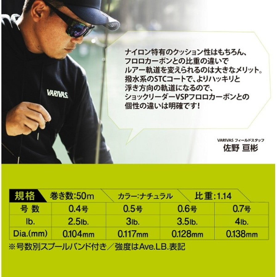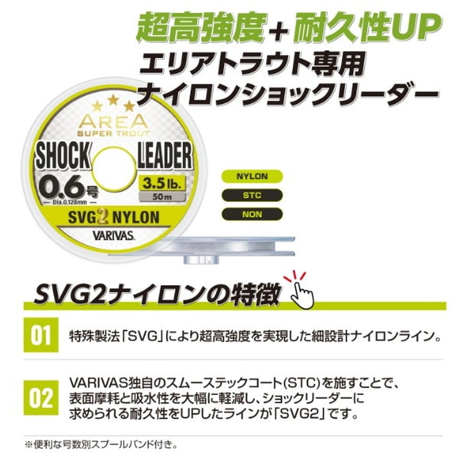 超高強度「SVGナイロン」+耐久性UP「スムーステックコート」エリアトラウト専用ナイロンショックリーダー。特殊製法「SVG」により超高強度を実現した細設計ナイロンライン。さらにVARIVAS独自のスムーステックコート(STC)を施すことで、表面摩耗と吸水性を大幅に軽減し、ショックリーダーに求められる耐久性をUPしたラインが「SVG2」です。「ショックリーダーVSPフロロカーボン」と使い分けることで、より幅広いアプローチが可能。エリアトラウトシーンをさらに深くします。※便利な号数別スプールバンド付き。