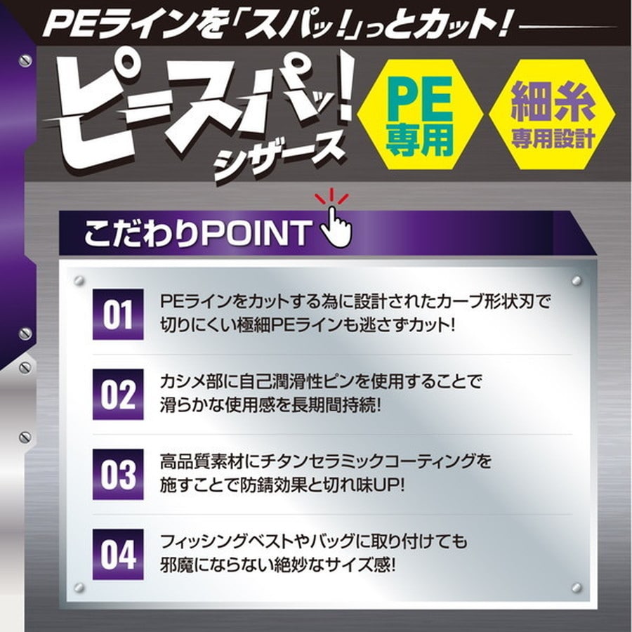 PEラインを「スパッ!」とカット!ラインメーカー『VARIVAS』が贈るPEシザースの決定版!匠のノウハウを集結させたPEライン専用設計!【こだわりPOINT】●鋭い切れ味が長持ちする、高硬度に熱処理したステンレス合金鋼を採用。●チタンセラミックコーティングを施すことで防錆効果と切れ味UP。●長年の研究によって編み出された、常に最適な交差角を保つカーブ 形状刃で、切りにくい0.2号前後の極細PEラインでも逃さずカット。●緻密に計算された噛み合わせ角度により、ギザ刃と同等の切れ味を実現。 ギザ刃を使用しないことで、鋭い切れ味を長期間維持します。●カシメ部に自己潤滑性ピンを使用することで、滑らかな使用感を持続。●刃の先端を先丸形状にすることにより、安全な使用が可能。※便利なピンオンリール用ホール付き。