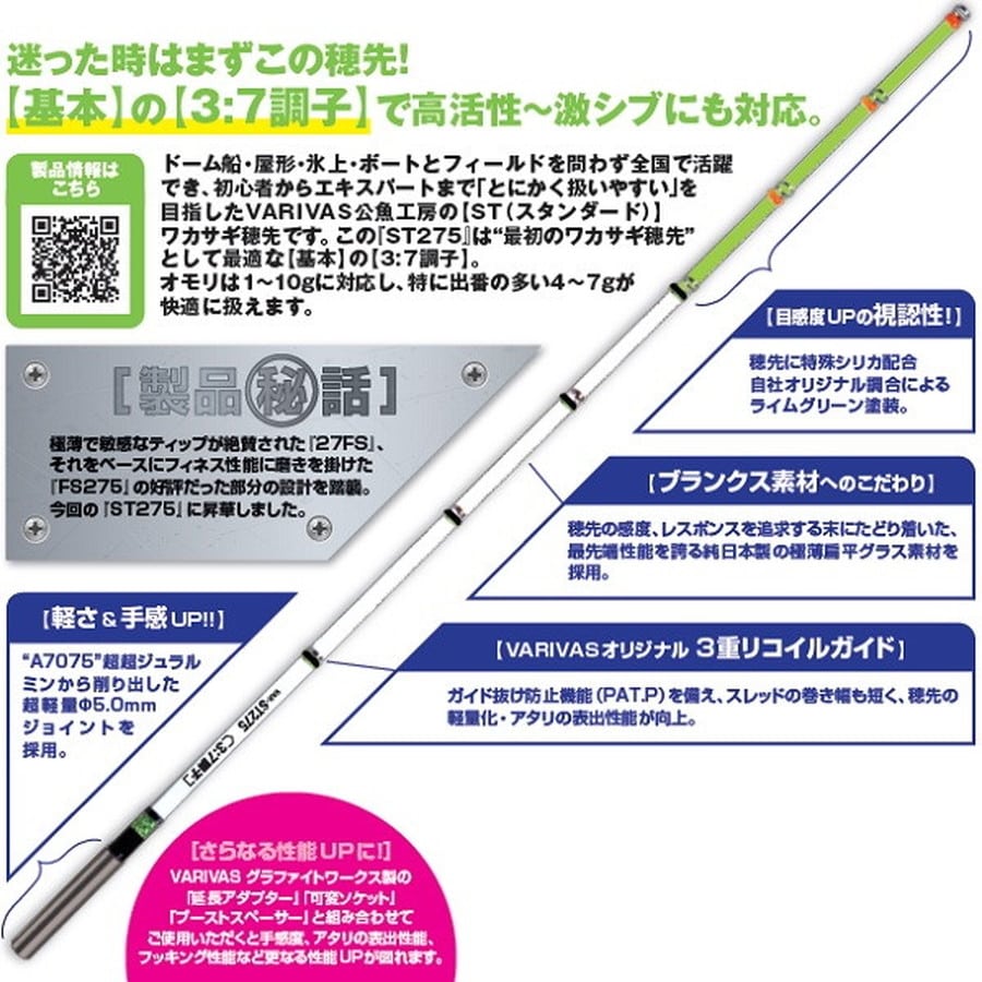 迷った時はまずこの穂先!ドーム船・屋形・氷上・ボートとフィールドを問わず全国で活躍!初心者からエキスパートまで「とにかく扱いやすい」を目指したVARIVAS公魚工房の「ST(スタンダード)」ワカサギ穂先です。このST275は「最初のワカサギ穂先」として最適な基本の3:7調子。オモリは1~10gに対応し、特に出番の多い4~7gが快適に扱えます。