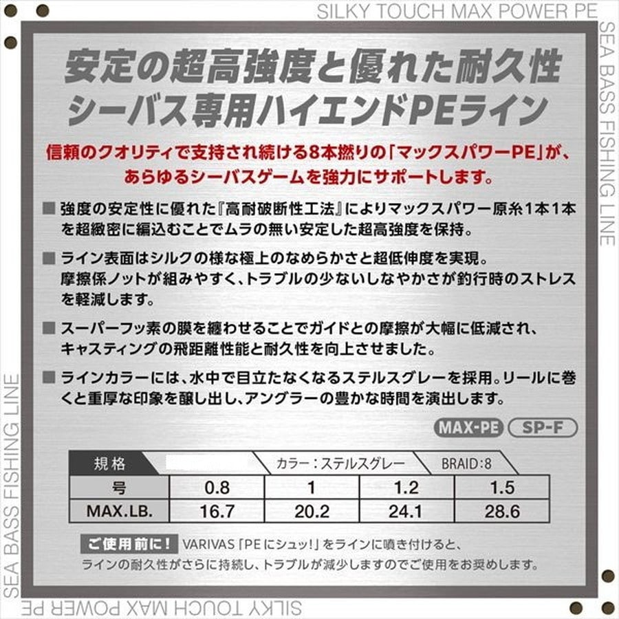 信頼のクオリティで支持され続けるシーバス専用マックスパワーPE。強度の安定性に優れた『高耐破断性工法』により、マックスパワー原糸1本1本を緻密に編込むことで、ムラの無い安定した超高強度を保持。ライン表面はシルクの様な極上の滑らかさを実現。摩擦系ノットが組みやすく、トラブルの少ないしなやかさで『釣行していてストレスが少ない』と高い評価を多くいただいています。ライン表面に独自の非フッ素コーティング(SP-V)を纏わせることで、ガイドとの摩擦が大幅に低減され、キャスティングの飛距離性能と耐久性を持たせています。ラインカラーは水中で目立ちにくいステルスグレーを採用。リールに巻いた時の雰囲気は重厚な印象を醸し出し、アングラーの豊かな時間を演出します。