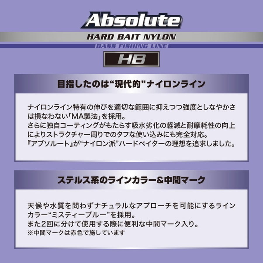 目指したのは『現代的』ナイロンライン。ナイロンライン特有の伸びを適切な範囲に抑えつつ強度としなやかさは損なわない「MA製法」を採用。さらに独自コーティングがもたらす吸水劣化の軽減と耐摩耗性の向上によりストラクチャー周りでのタフな使い込みにも完全対応。『アブソルート』が『ナイロン派』ハードベイターの理想を追求しました。ステルス系のラインカラー&中間マーク天候や水質を問わずナチュラルなアプローチを可能にするラインカラー『ミスティーブルー』を採用。また2回に分けて使用する際に便利な中間マーク入り。※中間マークは赤色で施しています