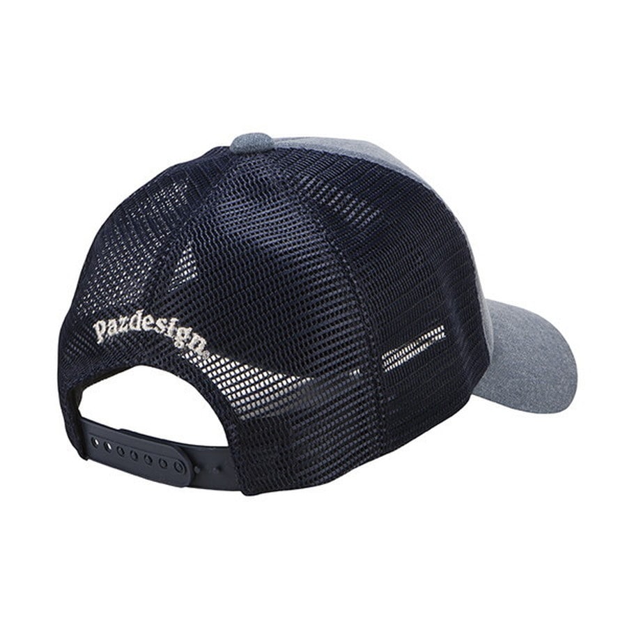 シックで使い勝手の良いデザインのメッシュキャップ!!使うほどに味のでるコットン生地を採用。6枚パネル。風合いのある生地を使用したフロントパネルにスクエアタイプのPazdesignロゴネームを縫い付けたメッシュキャップです。ソルト、フレッシュ、場面を問わず使えるシックなデザインです。