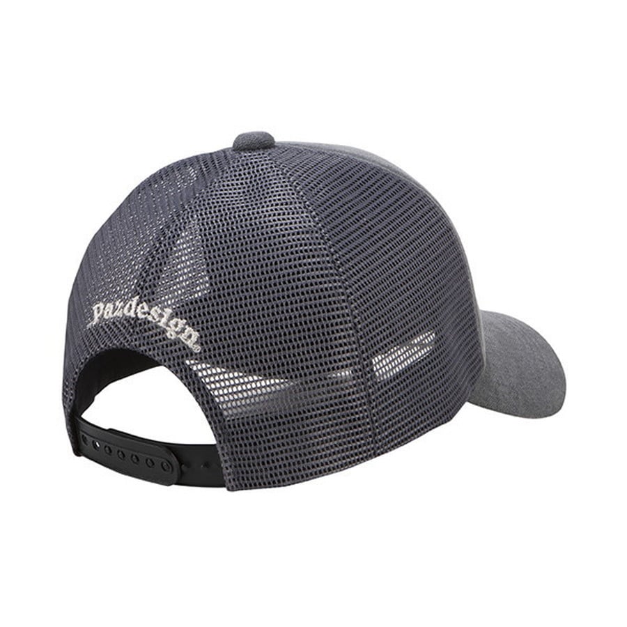 シックで使い勝手の良いデザインのメッシュキャップ!!使うほどに味のでるコットン生地を採用。6枚パネル。風合いのある生地を使用したフロントパネルにスクエアタイプのPazdesignロゴネームを縫い付けたメッシュキャップです。ソルト、フレッシュ、場面を問わず使えるシックなデザインです。