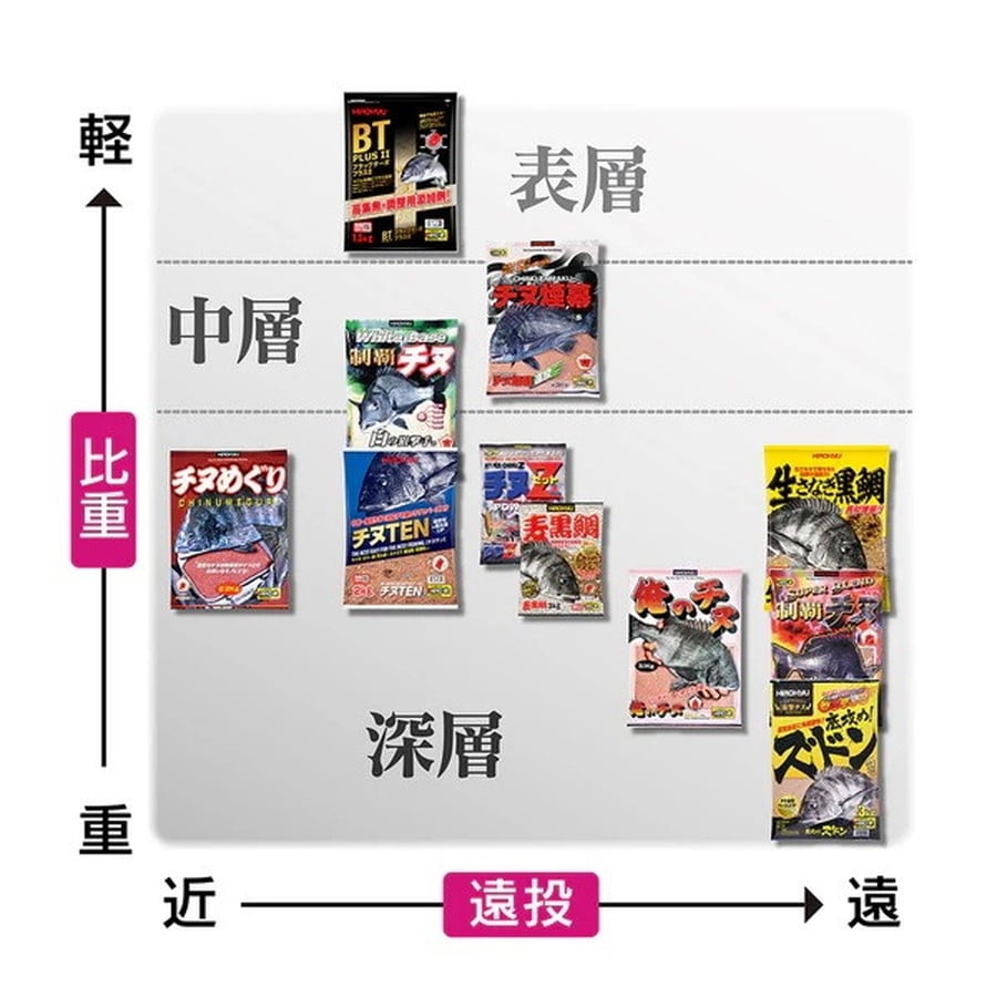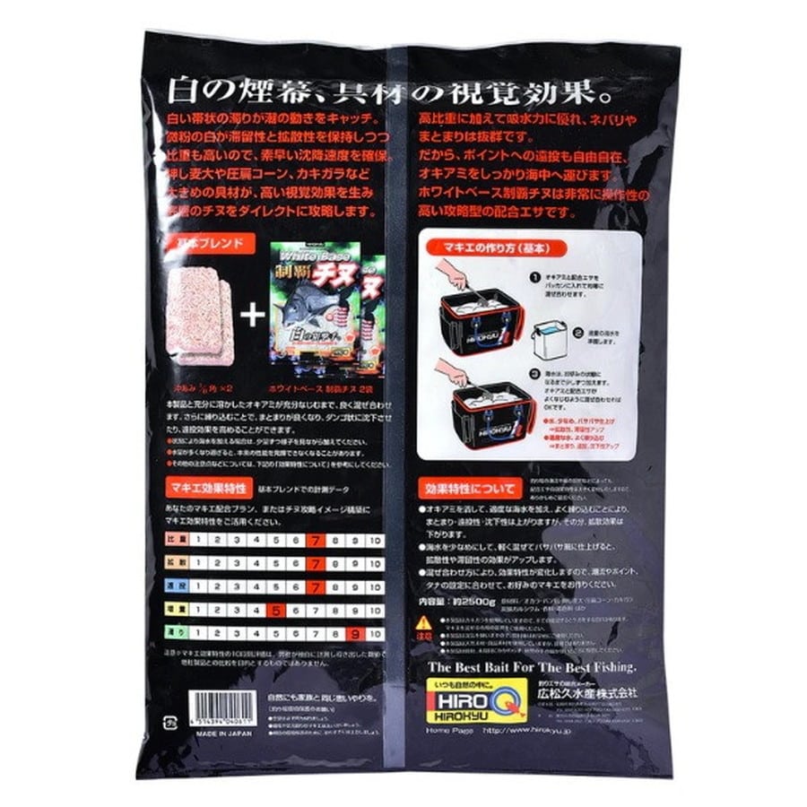 白い濁りが潮の動きをキャッチ。微分の白が滞留性と拡散性を保持しつつ比重も高いので、素早い沈降速度を確保。高比重に加えて吸水力に優れ、ネバリやまとまりは抜群。だからポイントへ遠投も自由自在。ホワイトベース制覇チヌは非常に操作性の高い攻略型の配合エサです。★内容量:約2.5kg