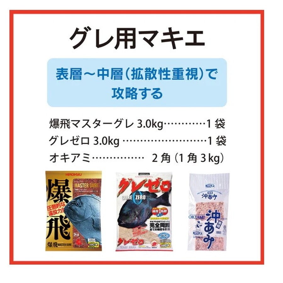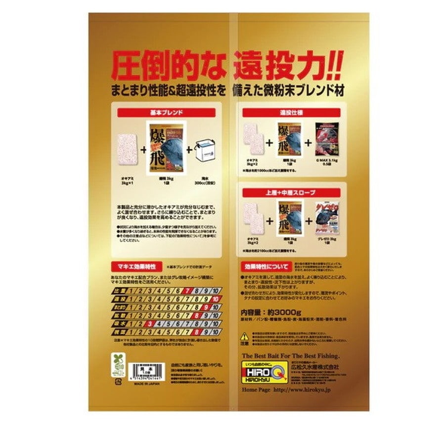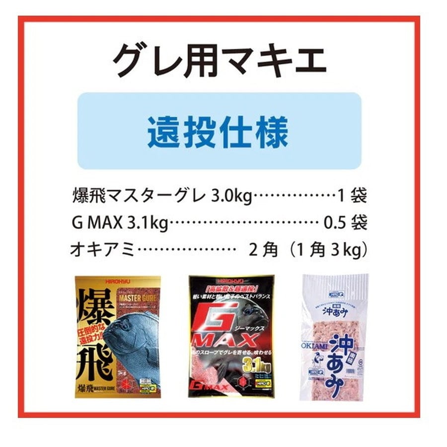 手早く簡単にオキアミとブレンドできるように具材を吟味。少量の海水(約300cc)で抜群のまとまり性を実現し、当社比120%の超遠投力を発揮。グレ用ブレンド材として使いやすさが大幅に向上しました。微粉末による高バランス配合は海中での拡散性に富み、スロープ状に広がってグレを寄せます。★内容量:約3.0kg