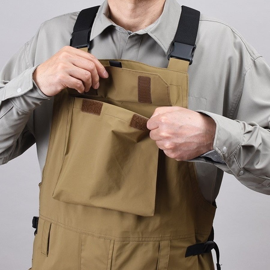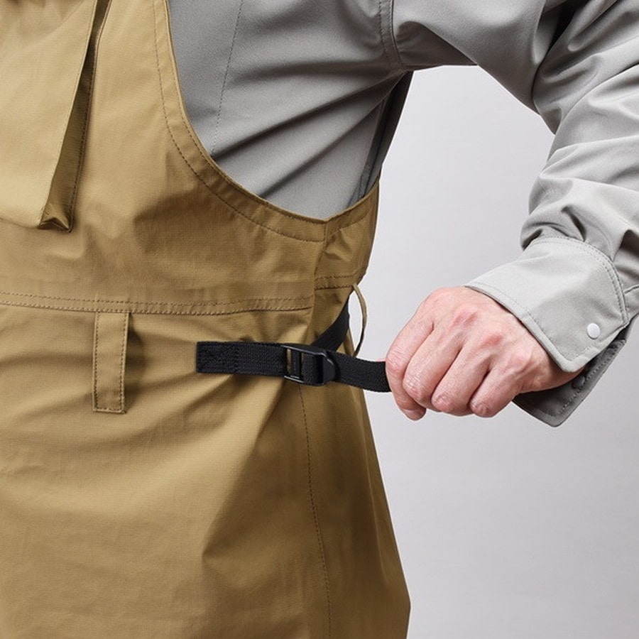 透湿防水オーバーオールSCレインジャケットとのセットアップを考慮した透湿防水オーバーオール。ジャケットフロント部からの浸水を防ぐサロペットタイプ。本体軽量ナイロン3レイヤー素材(aquamaxSUPREME透湿防水加工)。気温、湿度が高くなる時期や長距離移動時にもレイン内部の快適性を保つ透湿素材を使用。ショアアングラーの運動性を考慮した軽量モデル着用時にウエストサイズ調整が可能な左右アジャスター付きベルト。フラップ式ポケットは収納力を考慮したマチ付き仕様。