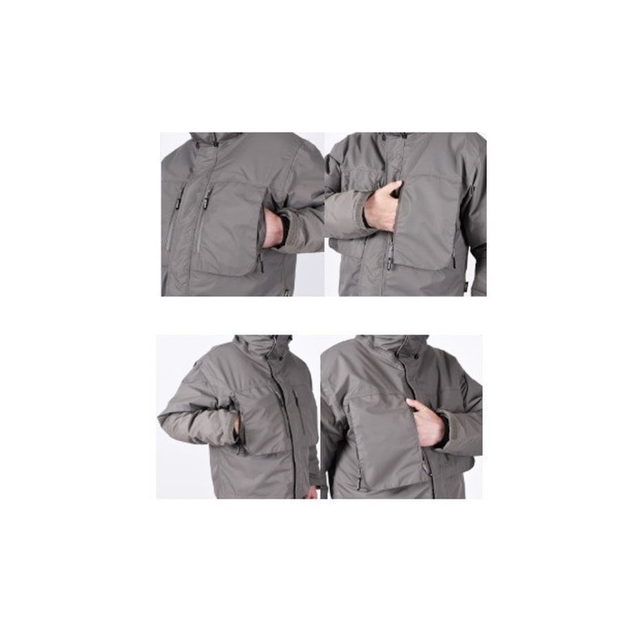 厳冬期仕様のウェーディングジャケット。解禁当初の河川や湖など、過酷な大寒期ウェーディングに対応する防水防寒ジャケット。表生地は強度、耐久性に優れるナイロン素材。ウェアー内部の湿度を適度に排出するウィンターウェアー専用『aquamax POLAR+』透湿防水加工。袖口クロロプレンカフやインナーフリース仕様など、荒天時にも対応可能なモデル。左右の大型胸ポケットは分別収納が可能な2気室仕様。明邦VS-906(SFCマルチL)サイズが収納可能。小型ランディングネット保持用背面Dカン付き。