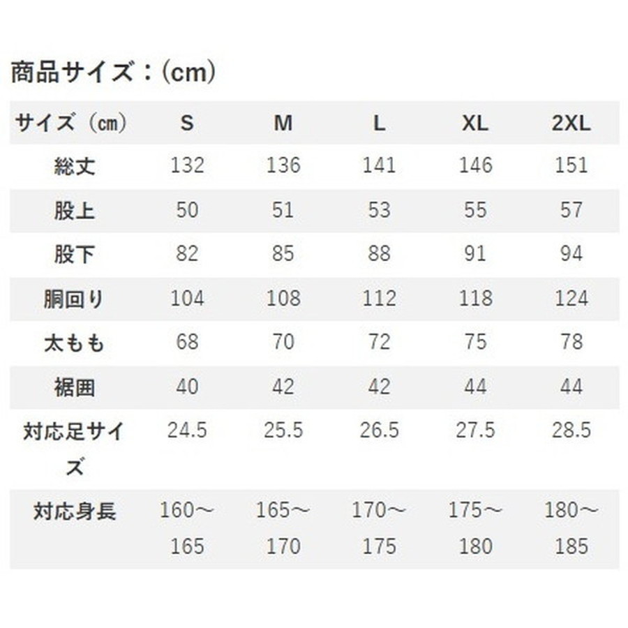 サイズ:L(総丈141cm、股上53cm、股下88cm、胴回り112cm、太もも72cm、裾囲42cm、対応足サイズ26.5cm、対応身長170-175cm)