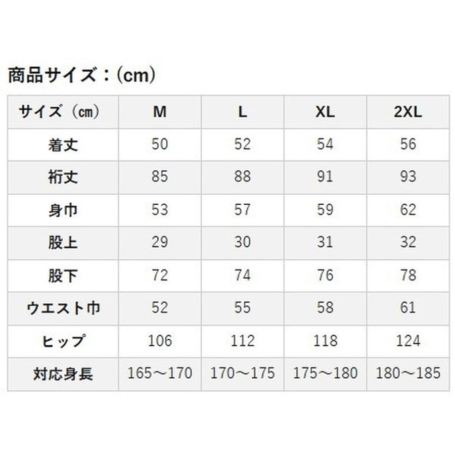 サイズ:L(着丈52cm、裄丈88cm、身巾57cm、股上30cm、股下74cm、ウェスト巾55cm、ヒップ112cm、対応身長170-175cm)