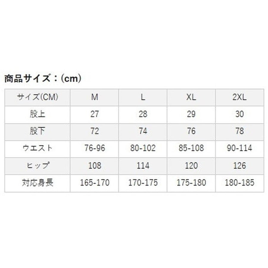 サイズ:2XL(股上30cm、股下78cm、ウエスト90-114cm、ヒップ126cm、対応身長180-185cm)