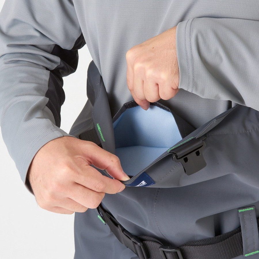 砂地対応PVCソール、透湿ウェーダー。本体素材は通気性と耐久性を兼ね備えた4レイヤー透湿素材(aquamaxSUPREME透湿防水加工)。通常の3レイヤー素材に透湿フィルムをラミネートした耐久性の高い新素材を使用。歩行時に砂や水分を吸収しないPCVソール仕様。砂地での歩きやすさ、アフターメンテナンスも考慮したオリジナルソール。本体とブーツドッキング部分は耐久性を考慮した2重構造。ブーツは紫外線ダメージ耐性に優れたPVC(塩ビ)素材。歩行しやすい適度なホールド感、水圧による足への圧迫を考慮したオリジナル設計。