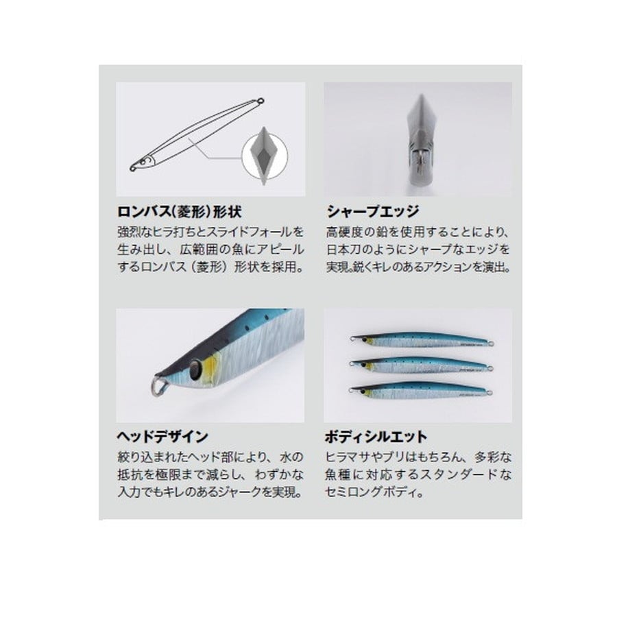 九州・玄界灘「達喜丸」監修のセミロングジグ。ロンバス(菱形)形状がもたらす強烈なヒラ打ちとスライドフォールが広範囲の魚にアピールし、ターゲットの捕食本能を呼び覚ます。日本刀のようにシャープなエッジと、絞り込まれたヘッド部により、水の抵抗を極限まで減らし、わずかな入力でもキレのあるジャークを実現。スタンダードなセミロングボディは、ヒラマサやブリはもちろん、多彩な魚種に対応。この一本で幅広い状況をカバーできる信頼のオールラウンダージグ。