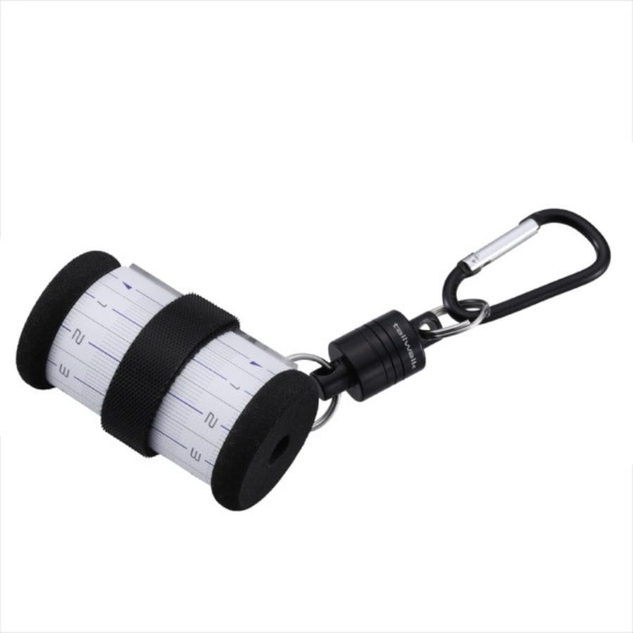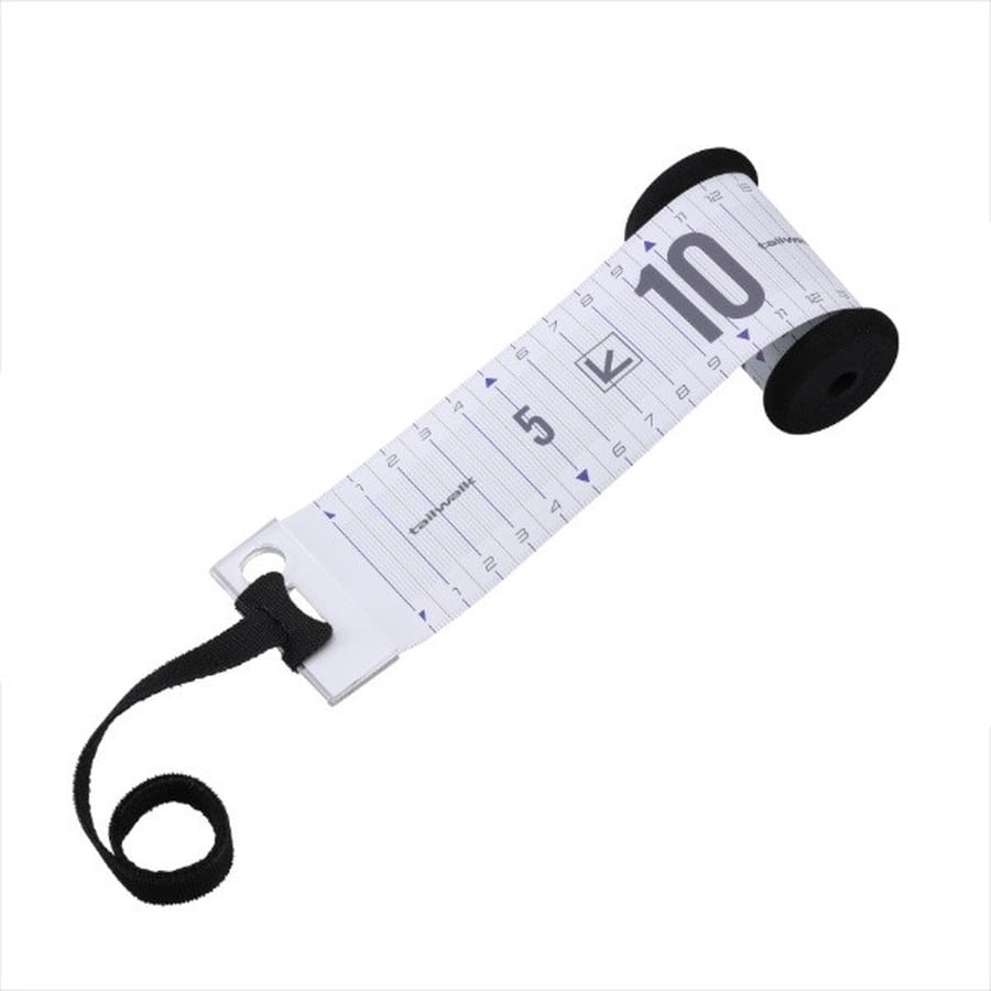 軸に巻き付けたメジャーはコンパクトに収納可能。付属のマグネット付きカラビナをバッグ等に取り付ければ携帯にも優れランガンスタイルの釣りにベストマッチ。全長130cm、幅5cmのPVCメジャー