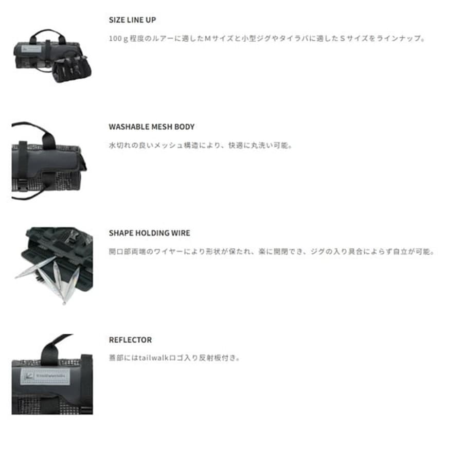 小型ジグやタイラバに便利なSサイズを追加ラインナップ。使ったジグをそのまま収納してジグごと丸洗い可能なお手入れ簡単ジグバッグ。開口部両端のワイヤーにより形状が保たれ、楽に開閉でき、ジグの入り具合によらず自立が可能。蓋部にはtailwalkロゴ入り反射板付き。