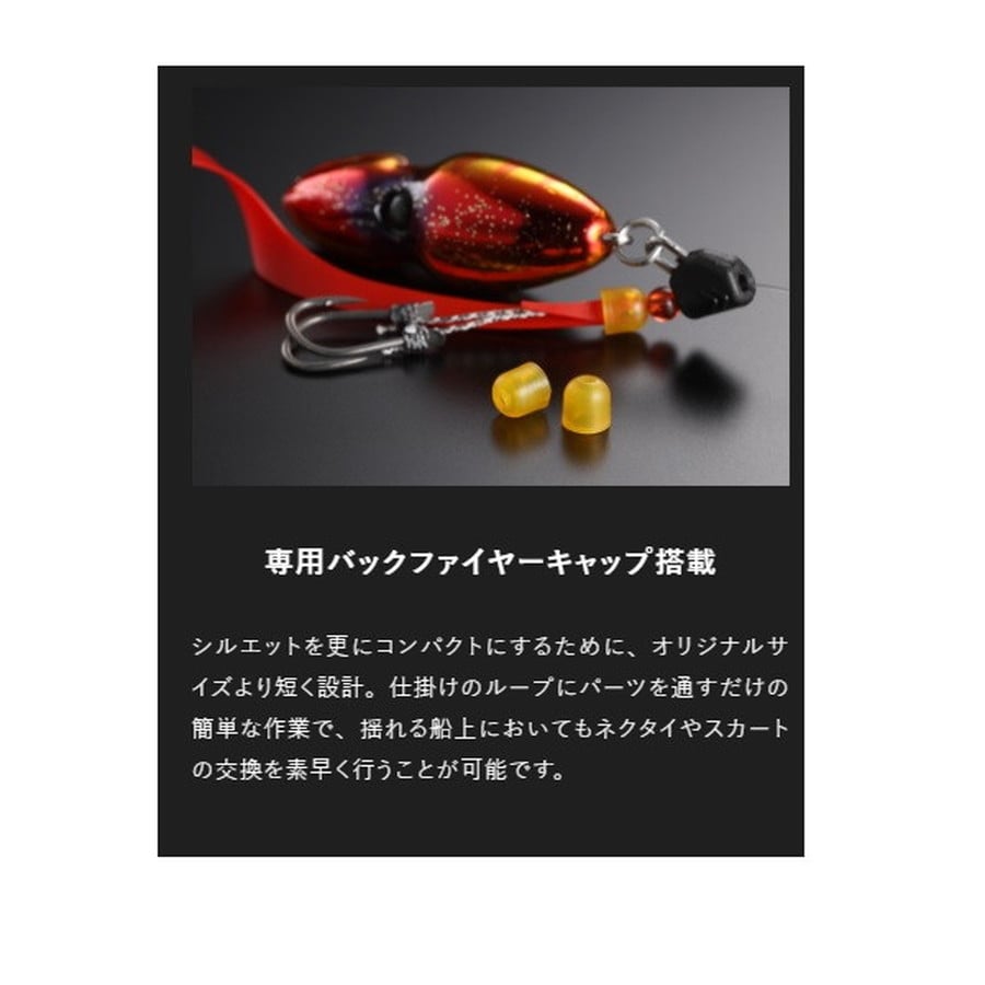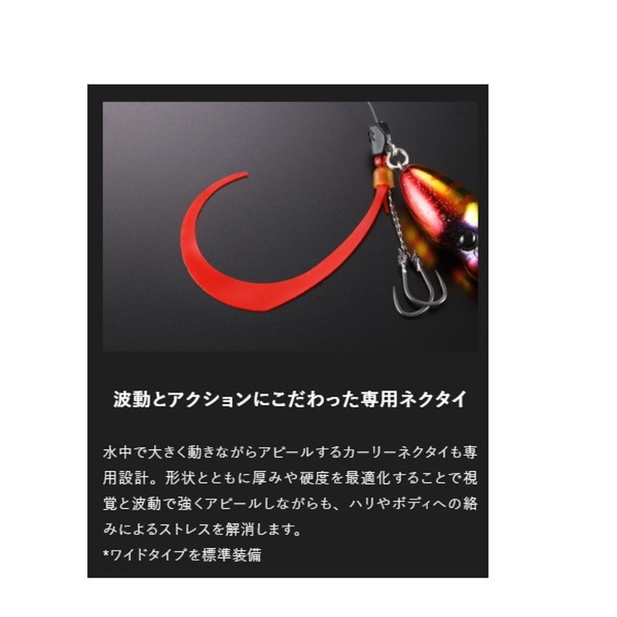 ●コンパクトシルエット。ヘッド、スカート、ネクタイが一連の従来の漁具型ルアーと異なり、ボディとネクタイ+フックを別パーツとして構成。さらに並列にセットしボリューム感を抑えたことでコンパクト化を実現。ボディへのバイトもフッキングに持ち込みます。●二枚潮をつき抜ける直進性能。流線型ボディをぶら下がり式にセッティング。水の抵抗を抑えた整流効果によって潮流に負けない速いフォールとファストリトリーブでもバランスを崩さず安定したアクションを可能にしました。●あらゆる魚種がターゲット。マダイ、ブリ、ヒラメ、アコウやカサゴなどのロックフィッシュまで、幅広いターゲットでオフショアゲームを楽しくします。●タングステン仕様。高比重タングステン素材を採用。コンパクトシルエットを実現すると共に、沈下速度が早く、底取りのし易さも大きな特徴です。●遊動式スイッチシステム。専用設計されたスライドパーツは、ラインへのダメージを極限まで抑える耐摩擦樹脂を採用。遊動仕様によりバラシを大幅に軽減します。ボディ本体はスプリットリングにて交換可能です。