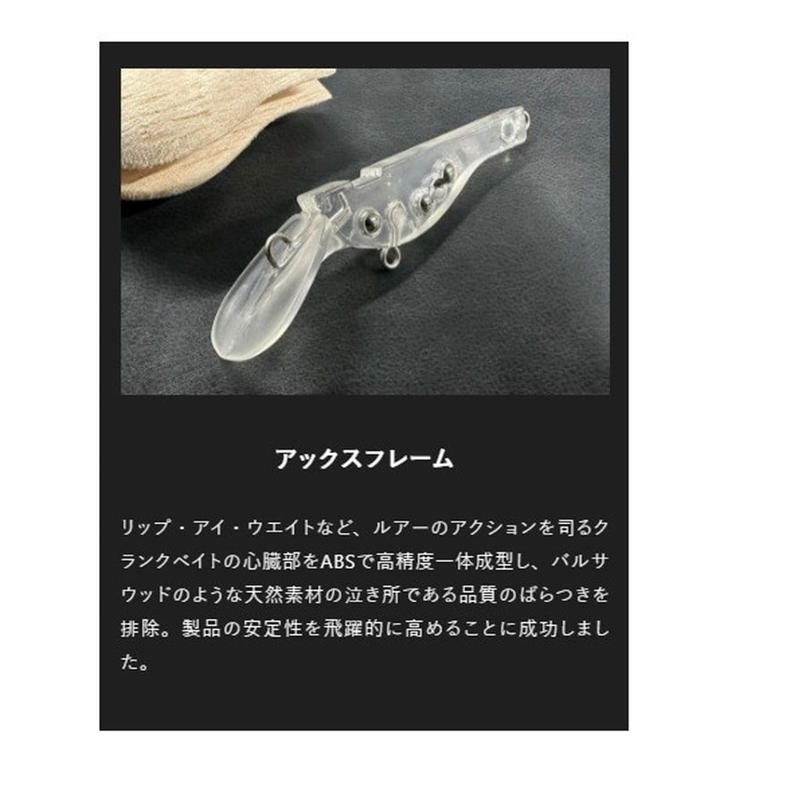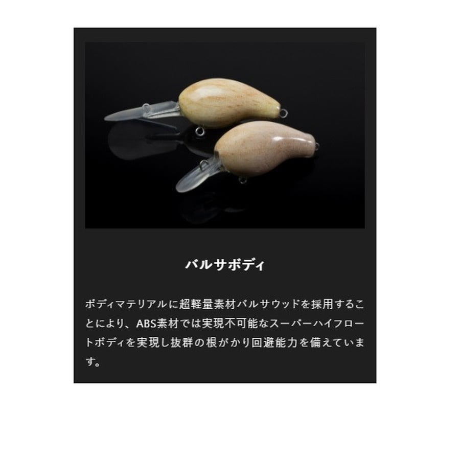 カバークランキング対応!!バルサ製スモールクランクベイト。超軽量素材バルサウッドボディ●ボディマテリアルに超軽量素材バルサウッドを採用することにより、ABS素材では実現不可能なスーパーハイフロートボディを実現し抜群の根がかり回避能力を備えています。また軽量ボディにより、パワフルかつ超ハイピッチウォブル&ロールアクションを兼ね備えています。