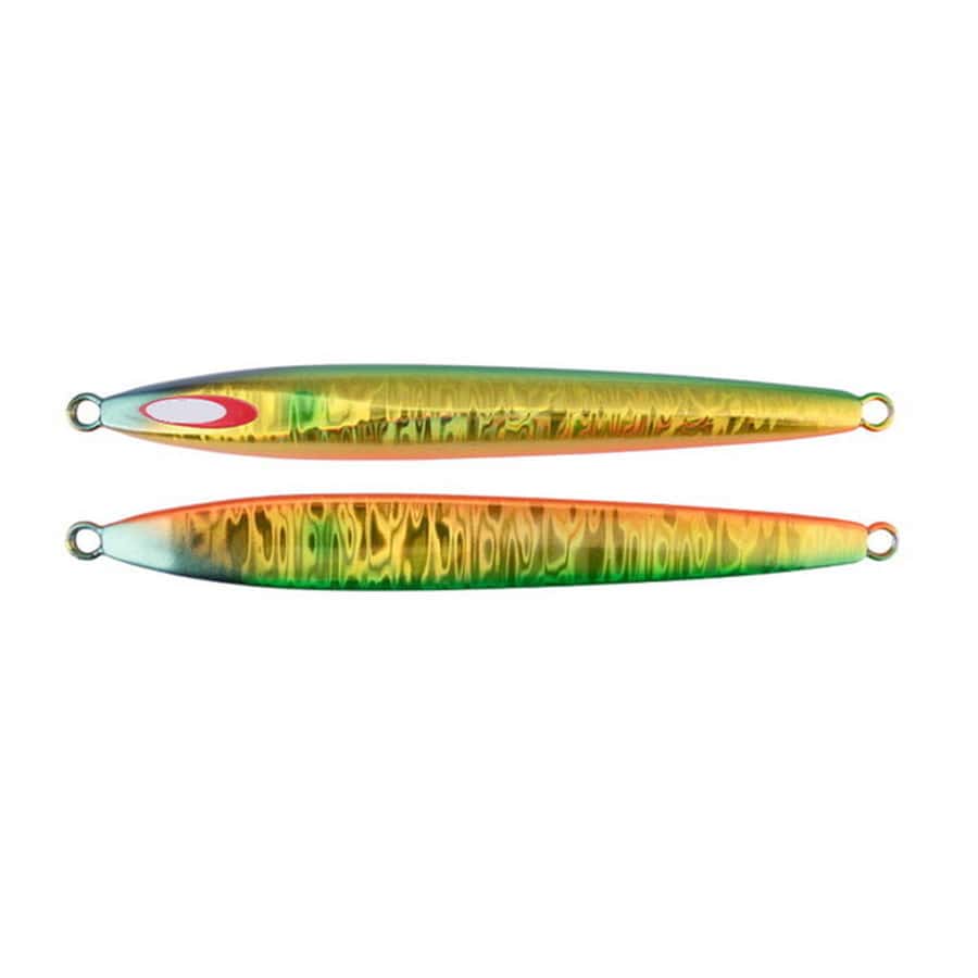 フォールでじっくり誘うハイアピールタイプ。フォールアクションに特化したハイアピールジグ。アンチョビメタル TYPE-IIのトリッキーな水平フォールアクションは、ロッドを大きく持ち上げるスロージギングスタイルでの使用に最適です。魚のヒットレンジがある程度絞り込まれた状況であれば、リフト&フォールを繰り返し、じっくりと魅せる釣りが有効です。明確に使い分けられるアクション設定。ワンピッチショートジャークにおいてもTYPE-Iに比べてワイドなアクション設定の為、ジグの使い分けを明確に行う事が可能。テスト段階からタチウオをはじめ様々な魚種を虜にしてきた高実績メタルジグです。【2024 NEW COLOR】グリキン/マグマウェーブホロ:ゴールドの激しいフラッシングと、ナチュラル要素のグリーンを合わせたカラー。アピール系ながらも、アカキンより一段喰わせ寄りであるとともに、深場での実績も高いカラーです。