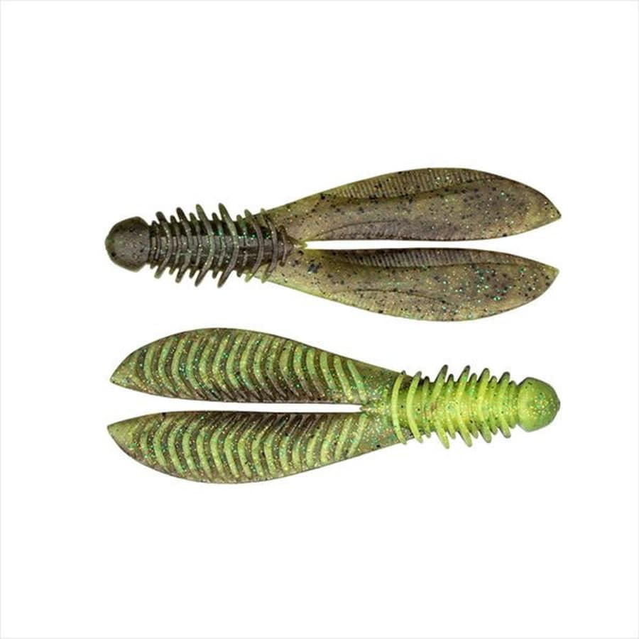 ボディ全体に掘られたリブが水を掴み、強く水を動かし存在をアピールします。テール裏のリブは放置していても僅かな水流を捉え揺らめき、フィネスなアプローチを可能にします。縫い刺しで使用する事で、アクション時やバイト時にトレーラーが針先に巻き込まれフッキングを妨げるリスクを低減します。やや細めのテール設計でカバーに対するすり抜けが抜群。リブの恩恵でボディ全体で水を受け、アクション時の抵抗感を生み出し移動距離を抑え、誰でも魚を呼ぶことのできるジグストアクションを演出可能です。
