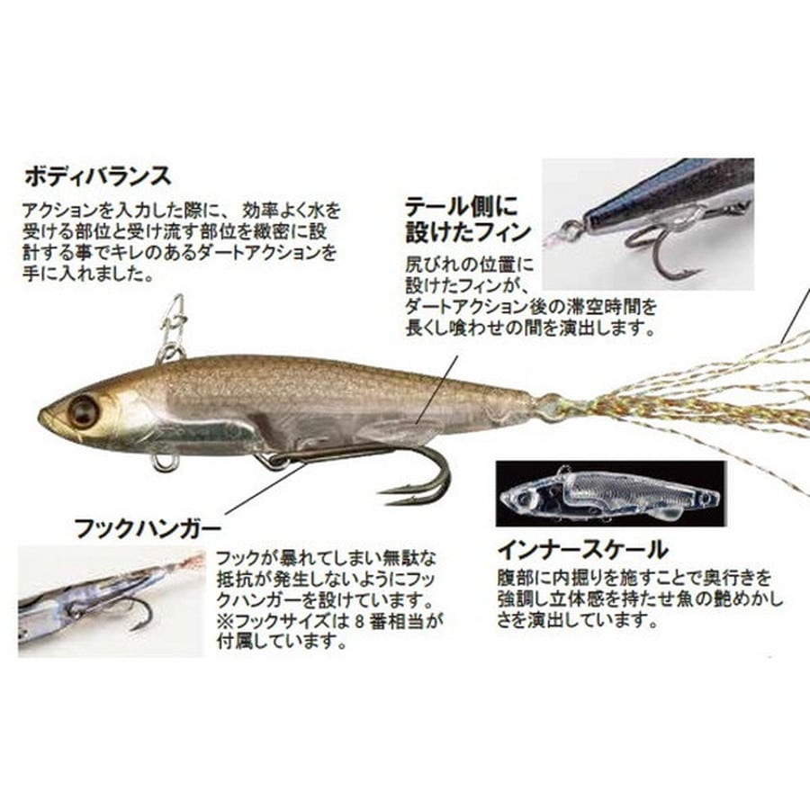 水中ボイルを発生させるトリガーアクション。捕食スイッチを入れる、キレのあるダートアクション。様々な方向に素早く、イレギュラーにアクションすることでフィッシュイーターの捕食本能を刺激します。食わせの間を演出する滞空時間の長いダート。キレのあるアクションに狂った魚に対して、喰わせの間を与える滞空時間の長いダートに拘り設計を行いました。キレのあるダートを支えるフックハンガー。フックをボディに固定する事で、無駄な抵抗を減らしキレのある滞空時間の長いダートアクションを手に入れました。魚が掛かるとフックはハンガーから外れます。★全長:52mm