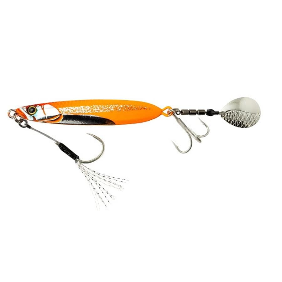 ただ巻きでOK 扱いやすさにこだわったブレードジグ。●ただ巻きOKのカンタン操作。ジャーキング・シャクリなどの難しいアクションは必要とせず、ただ巻きだけでオートマチックに釣れるアクションを演出し、青物を魅了します。操作感や飛距離、トラブルレス性能にも徹底的にこだわり、より快適に・より簡単に堤防青物を攻略することができます。●ハイバランス設計で快適な使用感。堤防・沖堤防での使用を想定し、ボディ・ブレード・アイ・フック・その他パーツに至るまで様々な要素でベストバランスを追究。安定した姿勢で低速~高速巻きまで対応するうえ、狙ったレンジを外し難く、足場の高い堤防でも足元近くまで巻き続けられる高いレンジキープ力を持ちあわせます。※最適なアクションを出すため、角度調整されたアイを採用しています。開封時のままご使用ください。●止めていても誘い続ける。フリーフォール・テンションフォール中もしっかりとブレードが回転し続けるため、ただ巻き後に「止め」を入れた際にもブレードが誘い続け、見切る隙を与えることなくバイトに持ち込むことができます。