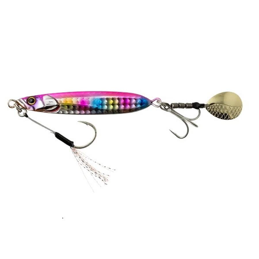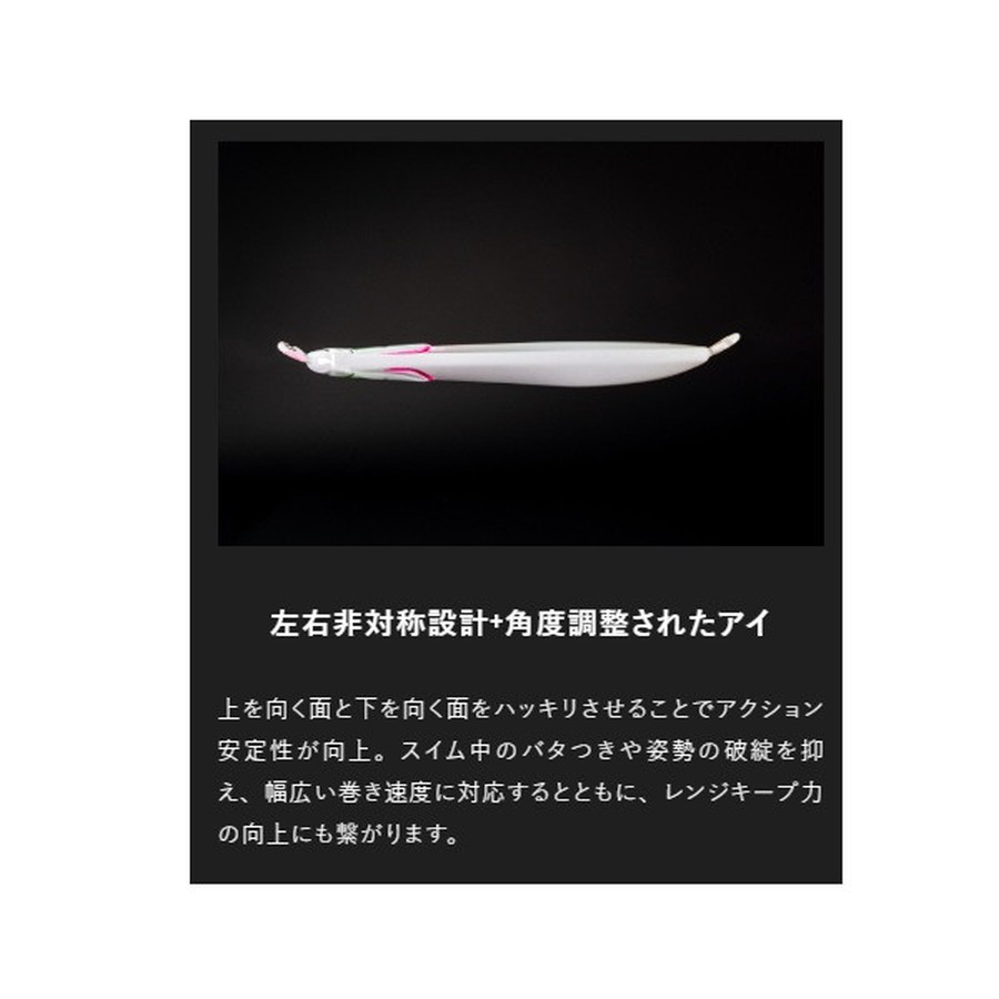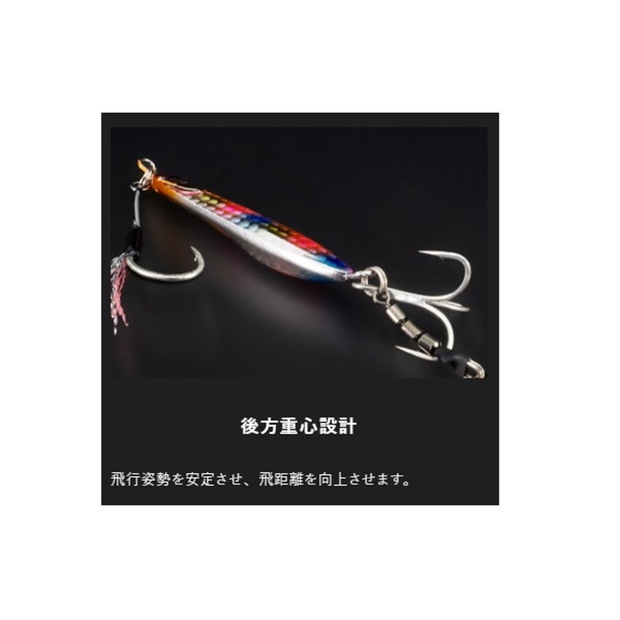 ただ巻きでOK 扱いやすさにこだわったブレードジグ。●ただ巻きOKのカンタン操作。ジャーキング・シャクリなどの難しいアクションは必要とせず、ただ巻きだけでオートマチックに釣れるアクションを演出し、青物を魅了します。操作感や飛距離、トラブルレス性能にも徹底的にこだわり、より快適に・より簡単に堤防青物を攻略することができます。●ハイバランス設計で快適な使用感。堤防・沖堤防での使用を想定し、ボディ・ブレード・アイ・フック・その他パーツに至るまで様々な要素でベストバランスを追究。安定した姿勢で低速~高速巻きまで対応するうえ、狙ったレンジを外し難く、足場の高い堤防でも足元近くまで巻き続けられる高いレンジキープ力を持ちあわせます。※最適なアクションを出すため、角度調整されたアイを採用しています。開封時のままご使用ください。●止めていても誘い続ける。フリーフォール・テンションフォール中もしっかりとブレードが回転し続けるため、ただ巻き後に「止め」を入れた際にもブレードが誘い続け、見切る隙を与えることなくバイトに持ち込むことができます。