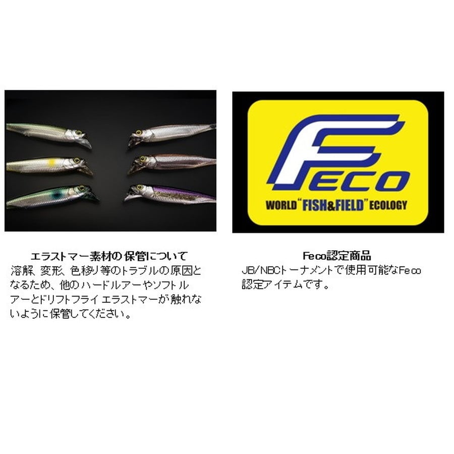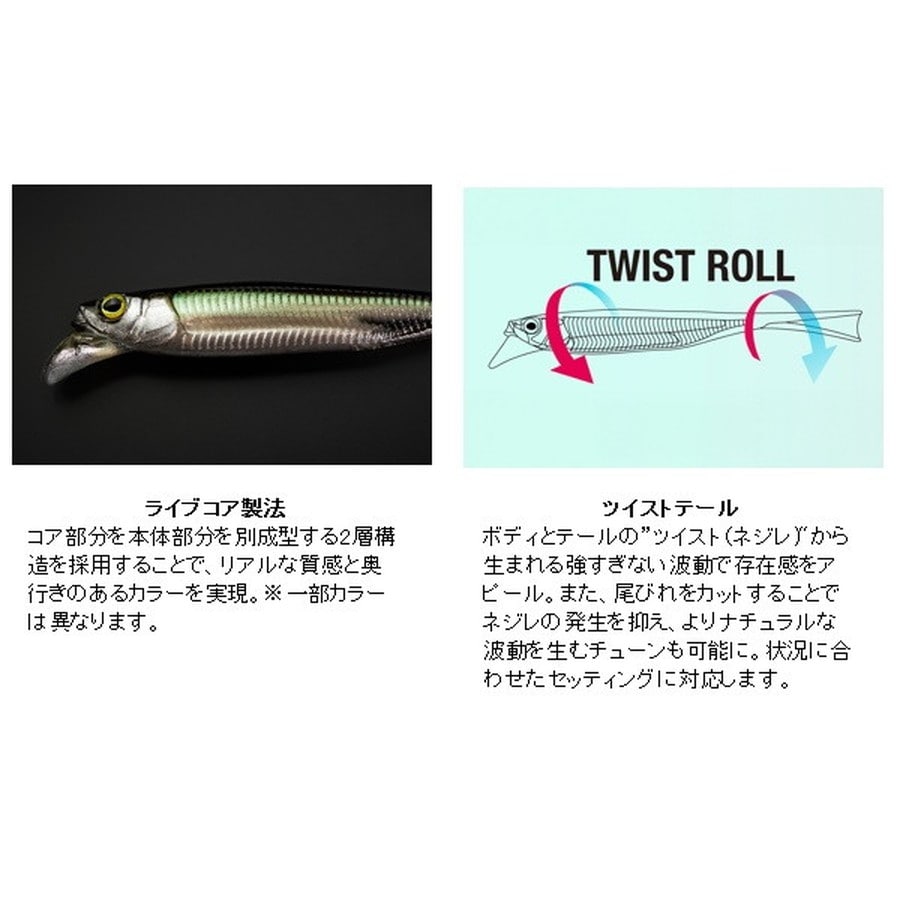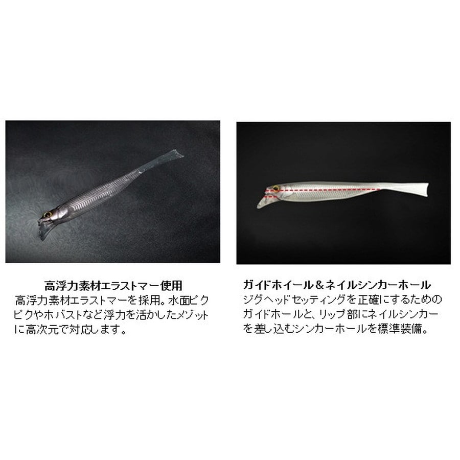 漂う、揺らめく、見せる、誘う。●サスペンドホバストセッティング…ネイルシンカーを刺し込むことでサスペンド設定が可能。一定のレンジを短い移動距離で誘うことができます。※使用するフックやライン・水温などの諸条件で微妙に変化します。●アングラーのイメージを具現化するリップ…ヘッドに設けたリップが水の抵抗を受けることで移動距離を抑え、レンジ(泳層)のコントロールをし易くすると共に、ロッド操作による入力をローリングアクションへ変換する役割を果たします。