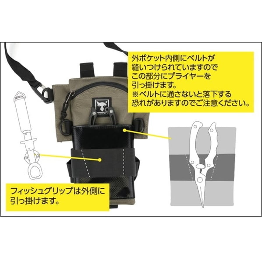 マルチレッグバッグは、現代のフィッシングシーンにおいて必須とも言える、フィッシュグリップ、プライヤー、スマホをひとまとめにすることで、ズボンのポケットのように簡単にアクセスができるアイテムです。オフショアフィッシングであれば、魚を船上にあげたらすぐにフィッシュグリップを取り出してキャッチ→スマホで撮影→プライヤーでフックを外す、、、といった流れを自身の荷物置き場との往復をせずに、スムーズに行えます。とくに揺れたり、他のアングラーとの距離が近かったりと、移動自体に制限の多い船上では、快適性の向上に貢献します。また、ショアフィッシングでも、これらのアイテムは意外と収納に困るシーンが多く、バッグに入れてしまうとすぐに取り出せないことも。魚を釣った時や、ルアー交換の際も手間取ることなく、アイテムの出し入れが可能です。収納可能なアイテムを絞りこむことで、本体はスマートに仕上がり、バッグのような大きな着用感は皆無。腰と太ももにベルトで着用することで、体への負担も軽減します。