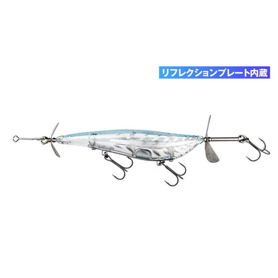 ジャークアクションで水しぶきを上げて魚に気づかせ、浮上させて喰わせるリッピングテクニックに高次元で対応。前後のプロップが奏でるサウンドはポッパーの甘いポップ音とは一味違う金属特有のサウンドでアピールします。ストラクチャー際などのピンスポット戦略やエビボイルパターンに有効です。付属の別注カスタムブレードを真ん中のアイにつけることでデッドスローリトリーブ対応モデルに仕様変更が可能です。ヨタヨタとアクションしながらブレードとリアプロップが不規則に接触し金属音を発生させ魚に気付かせます。また、イレギュラーなアクションがバイトトリガーにもなります。