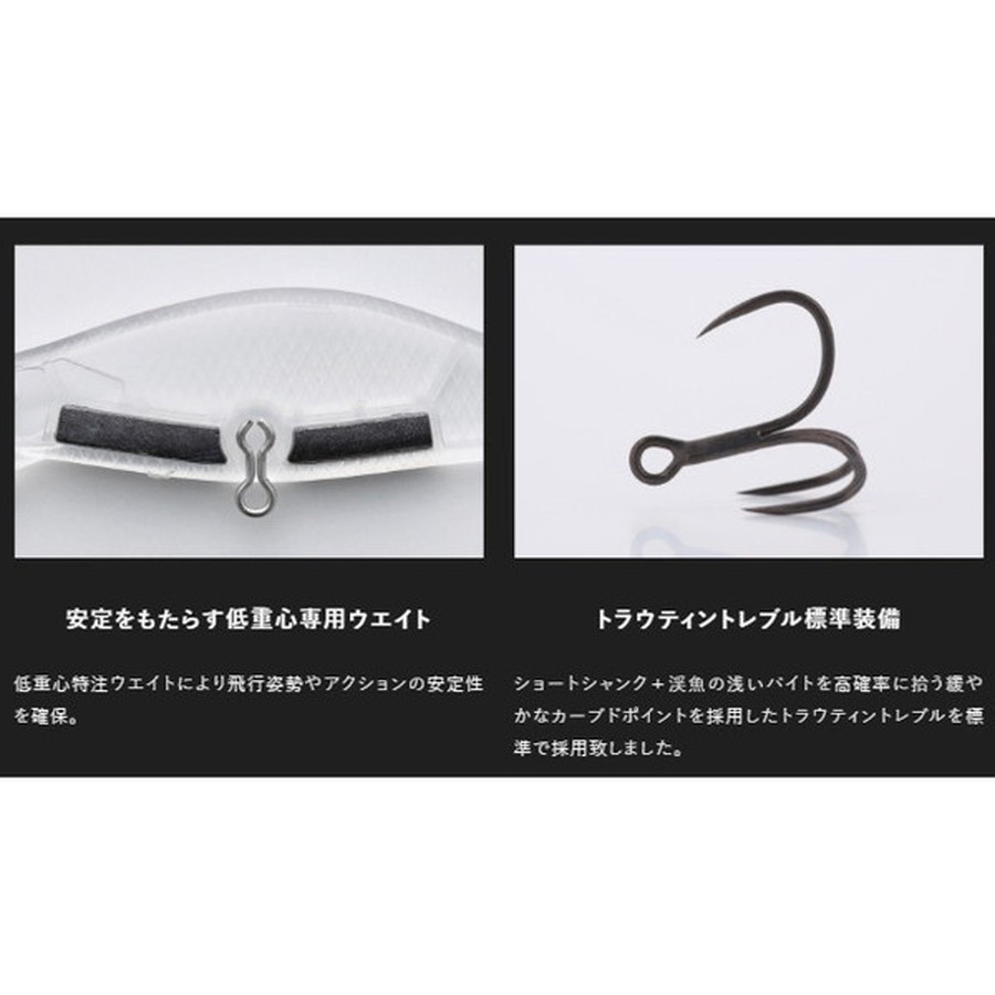 あえてヘビーウエイトにせずにシンキングにすることで更にアクションレスポンスを向上させました。シャローでも使いやすいため流芯シリーズとの使い分けが可能です。体高がある形状とボディーより僅かに幅の広いリップにすることにより水噛みが向上しアップストリームの釣りでも使いやすくなっています。